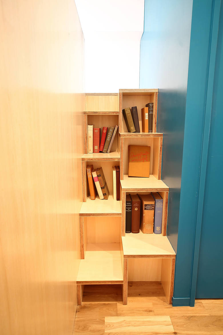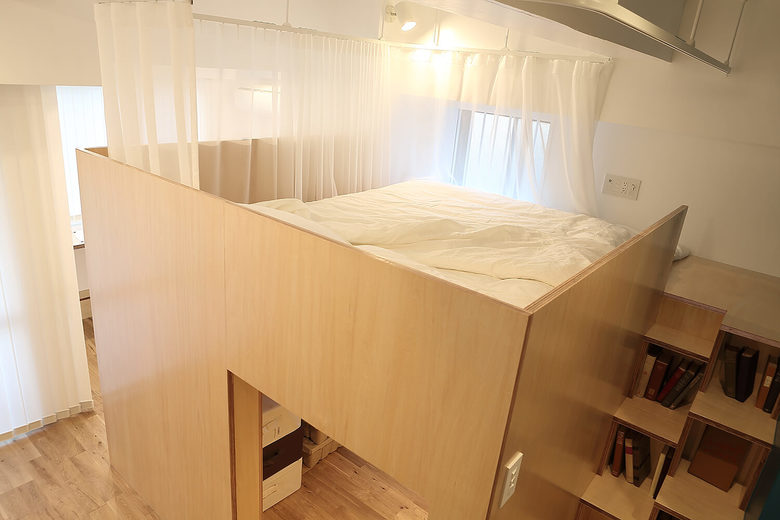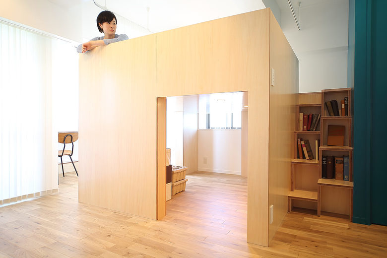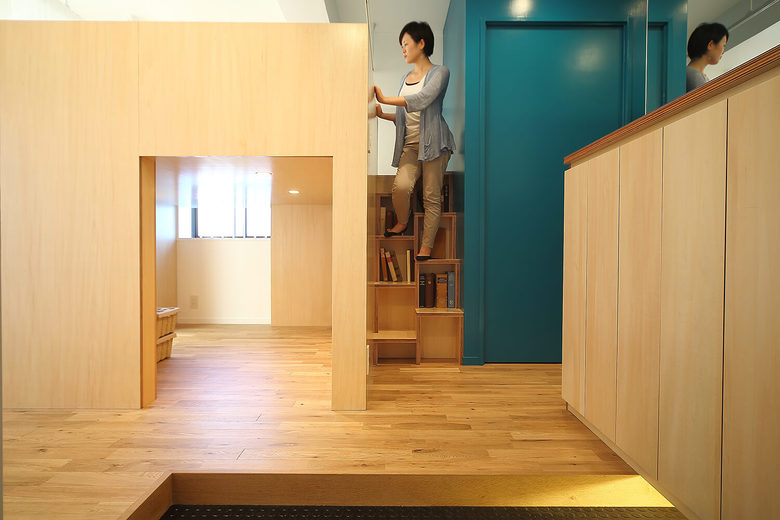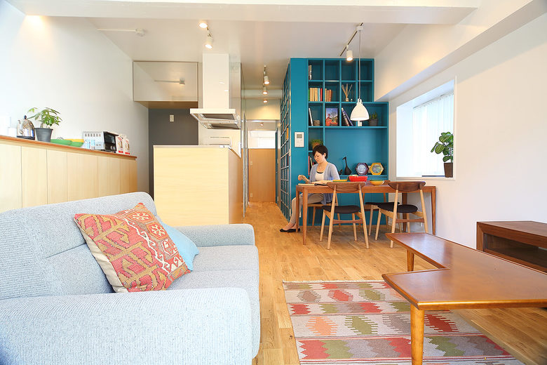 This is a model room for the full renovation of one entire 26 years old condominium. The theme was how to make the space feel wide and open, even in the narrowest premises of this condominium. The water systems are concentrated in the middle of the planning, dividing the whole into two sections. The outside wall of the box that contains the bathroom is embedded with a bookshelf, painted in calming turquoise blue, accentuating the space. The opposite box includes the toilet and a walk-in closet, and the outside wall is finished with mirror. The mirror not only vanish the existence of the box, but with its reflection it enlarges the space. There are no partition walls between the spaces; however, the boxes act as divisions of keeping a reasonable distance between the spaces.