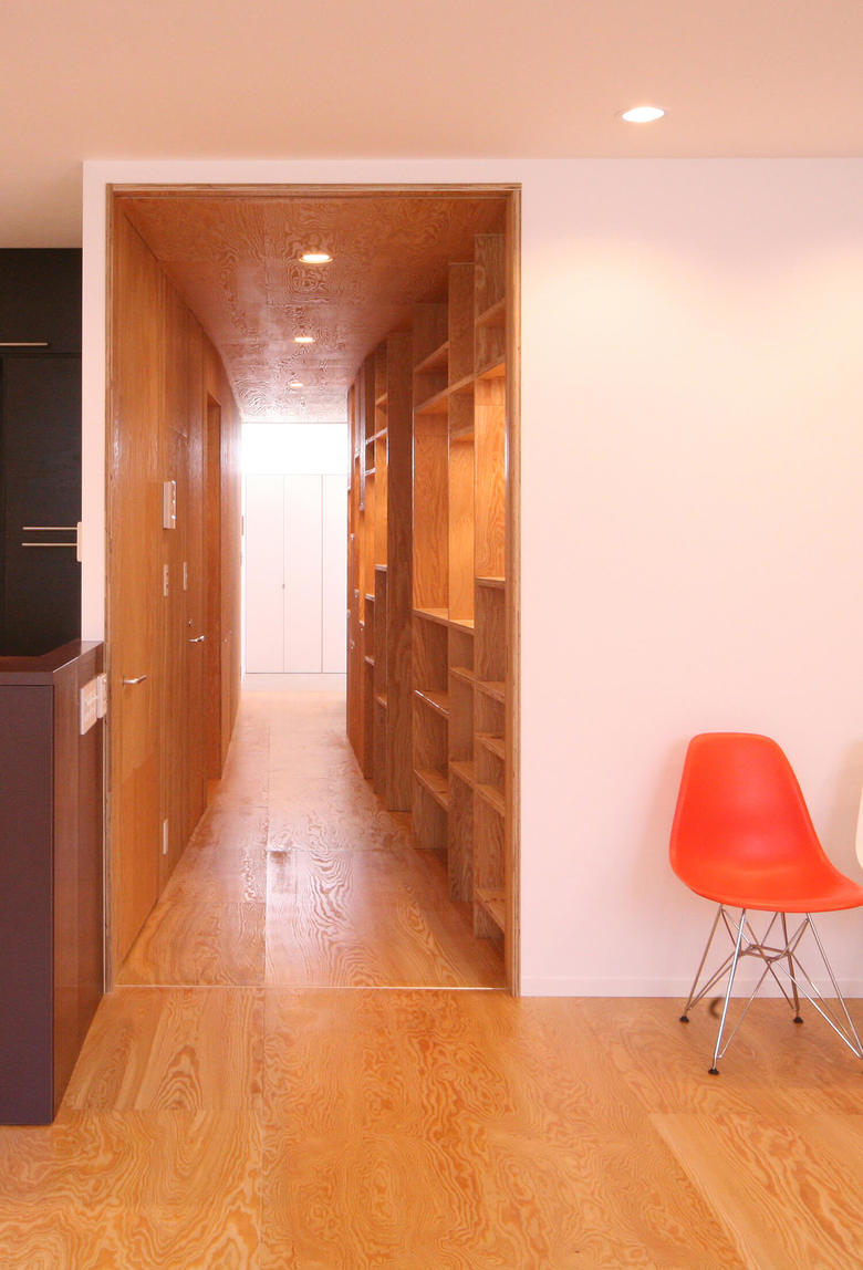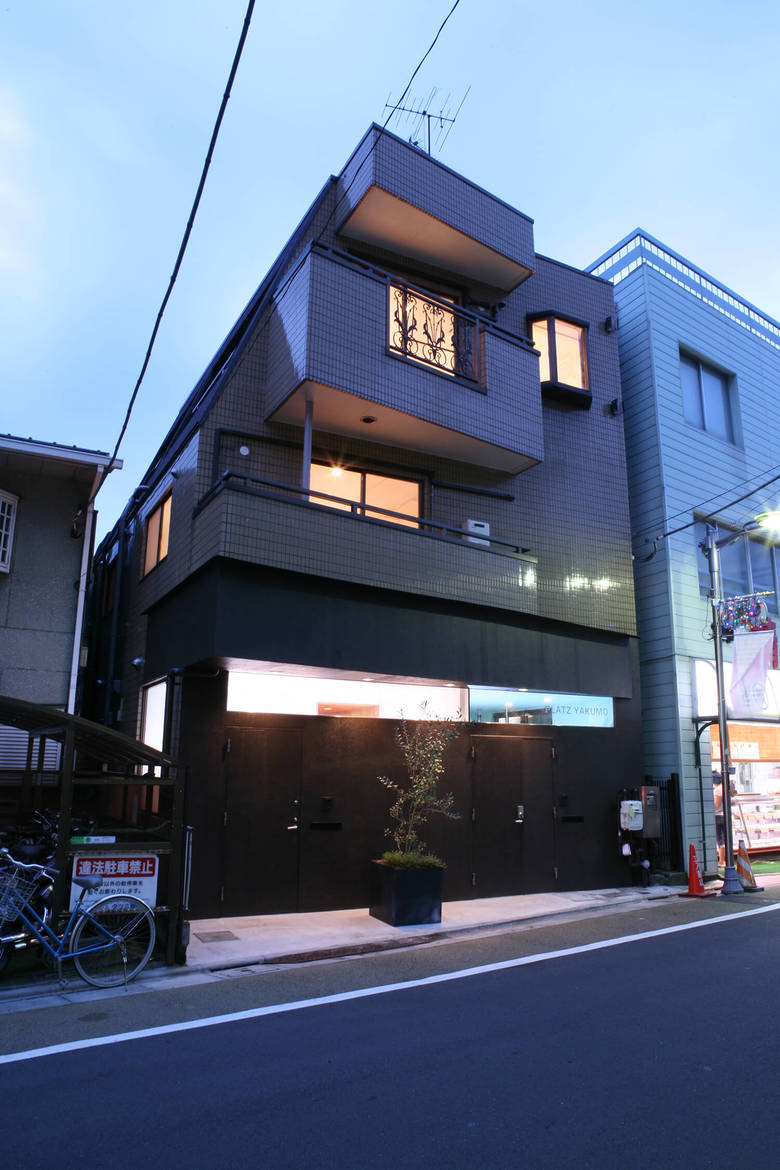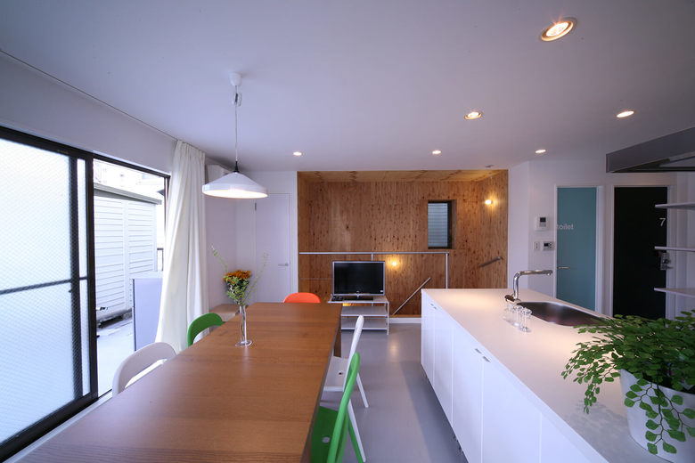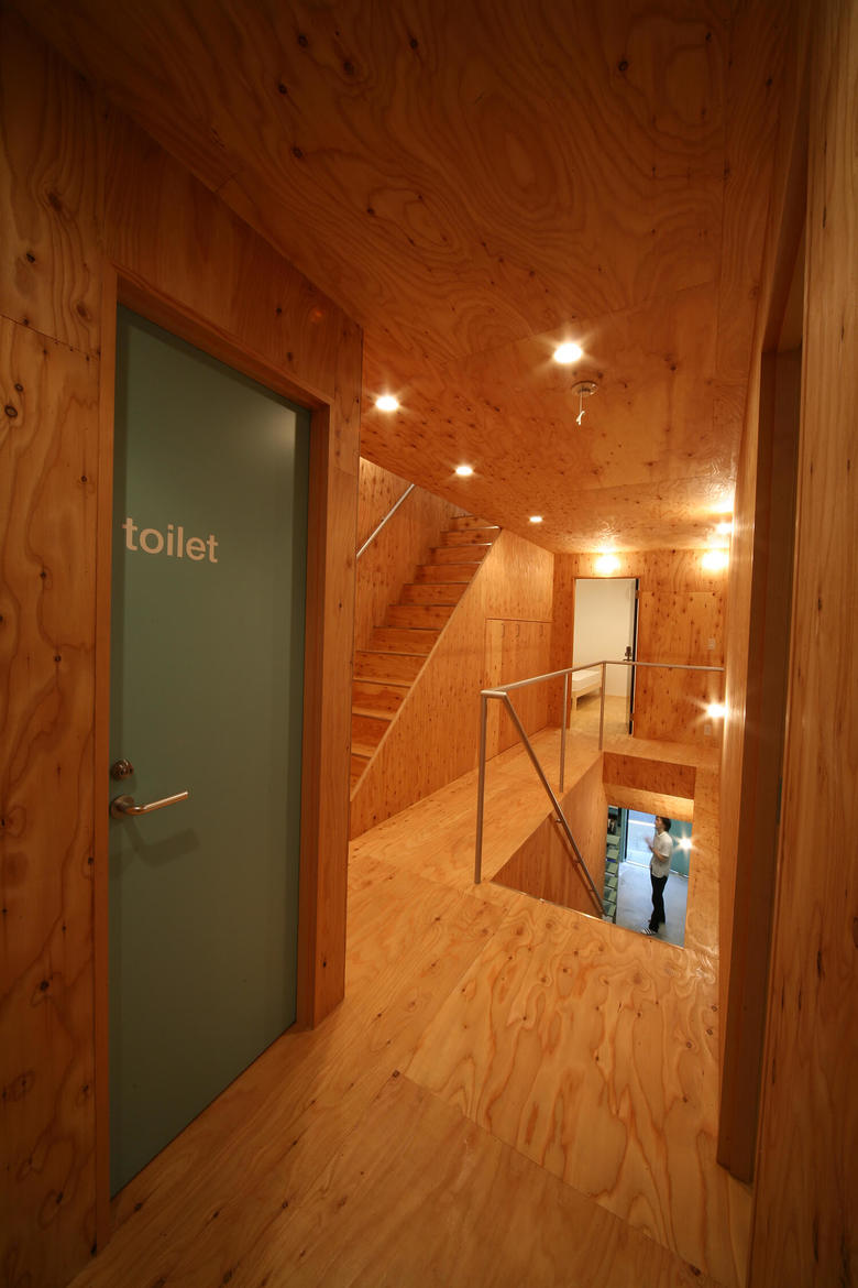 The ground floor façade is painted in dark brown, to coordinate with the exiting beige tile of the upper floors. Two different usages are expressed by the color of the interior walls that can be recognized from the slit windows above each entrance door. There was no way to avoid long corridors on each floor because of the narrow shape of the building, but by manipulating the corridor space, it has become an open and comfortable space.