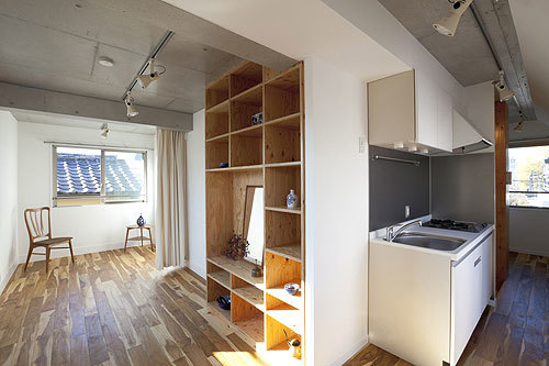 This housing complex consists of 9 one-room units measuring approximately 20㎡and 3 units measuring approximately 30㎡. The L-shaped design of the building as a whole secures an open space between the entryway and street, while two tree-shaped voids inside the building allow for a compact arrangement of balconies and walkways between units. The voids provide ventilation because they are oriented towards gaps in the densely-developed residential neighborhood surrounding the building; the chimney effect produced by the tall, tree-shaped voides further enhances air circulation. Light also pours in through the top of the voids. The units have a diverse range of floor plans, including I, L, C, T, and other shapes that wrap around the voids. Standout features of the exterior include concrete poured in larch plywood formwork and hot-dip galvanized metal window frames.
