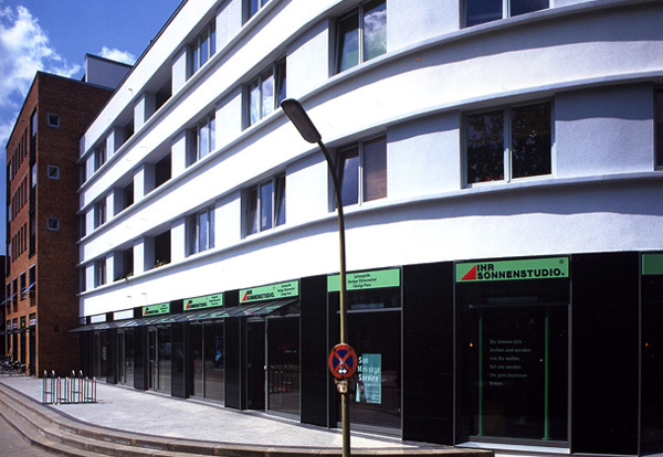 Das überbaute Eckgrundstück wurde mit einem markanten fünfgeschossigen gelb verblendeten Wohn- und Geschäftshaus bebaut, an das ein - dem gekurvten Straßenverlauf folgend - viergeschossiger, weiß verputzter Gebäudeteil angefügt wurde. Hieran schließt ein weiterer rot-gelb verklinkerter Wohnungsbau an.
