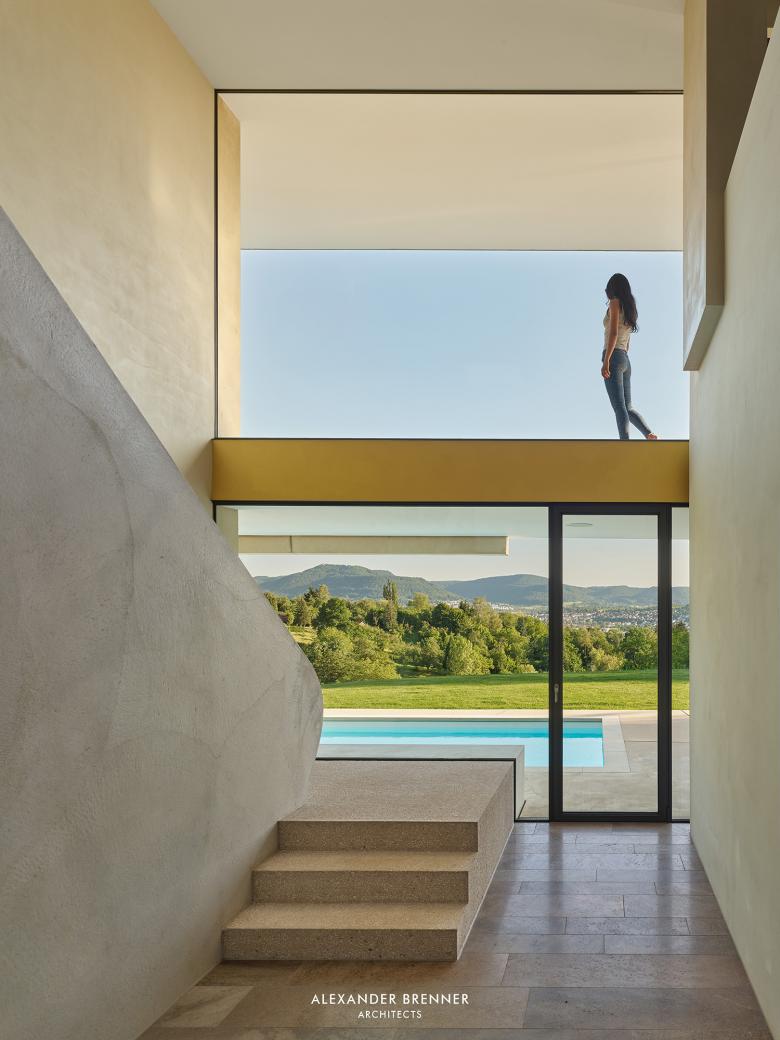 The modern villa was built on a plot of land on the outskirts of Reutlingen on a popular mountain trail, directly below the Achalm Mountain. To the north, towards this path, it appears like a stone, solid and closed and opens with floor-to-ceiling glazing to the view in the south. Here the view wanders over the pool and the wide valley. For energetic reasons and for reasons of sustainability, the outer walls consist of 50 centimeter thick aerated concrete and a refined exposed concrete shell of 25 centimeters. By adding local Jura chips as aggregate, it appears in a warm gray beige after refining. The façade, handcrafted by chiseling, pointing and charring, presents itself with a rough, archaic relief structure. Inside, too, stonemasons created a very special atmosphere thanks to the bush-hammered concrete on fixtures, stairs and parapets, which is reminiscent of the stone power of historical buildings. The calming feeling of firmness and durability is encouraged by limed walls, natural stone and oak flooring.