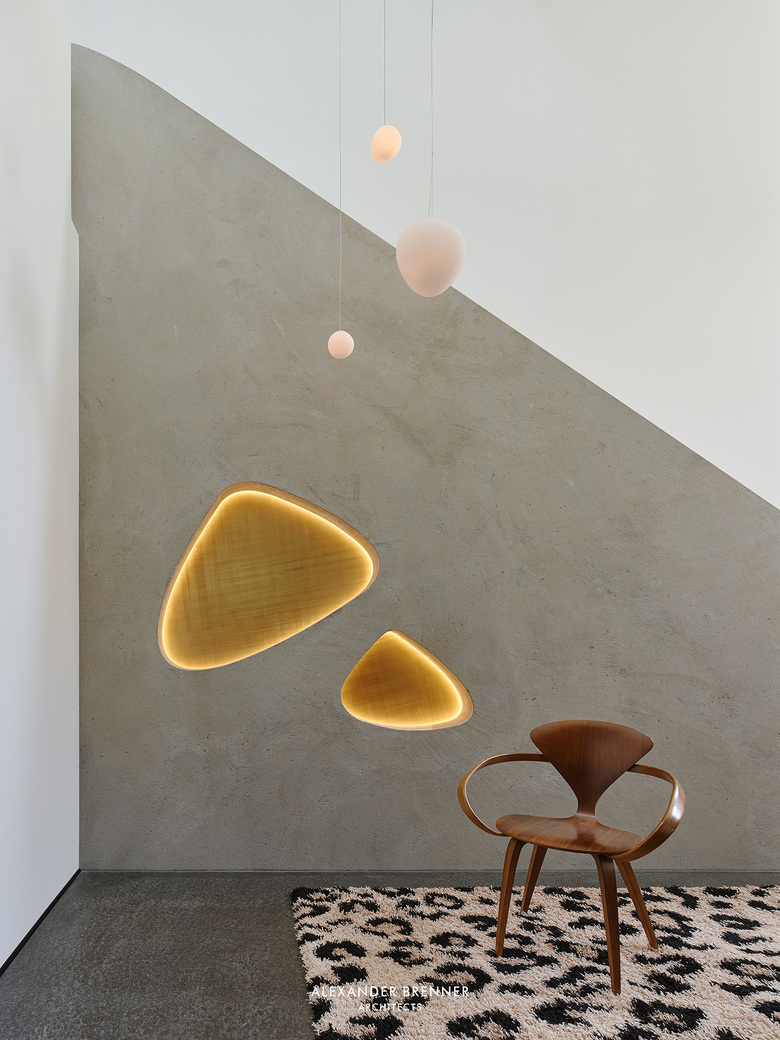 Upstairs are the bedrooms of the family of three, bathrooms, and a studio.