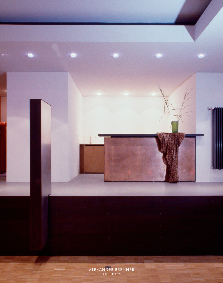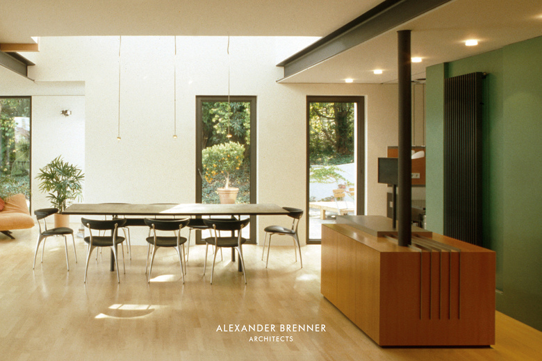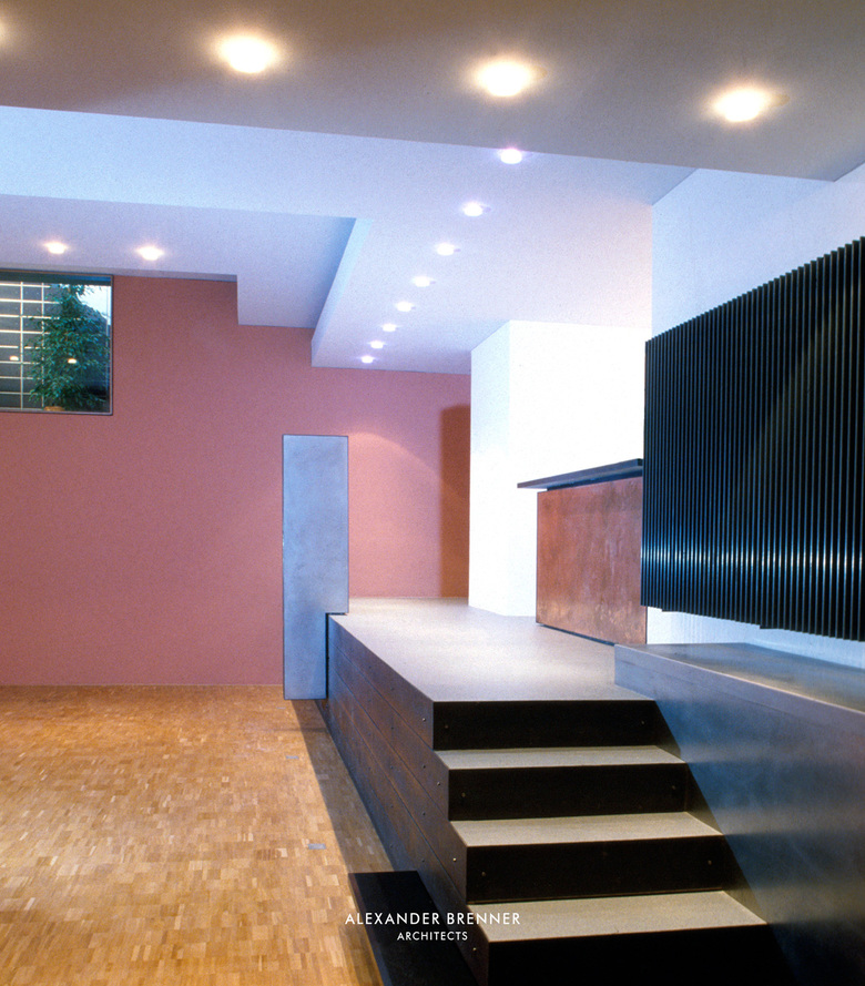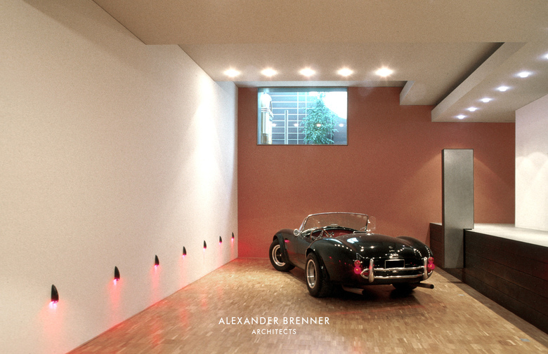 This house is situated on the Wernhalde ridge, among a development of free-standing detached houses typical of hillside locations in Stuttgart. The terrain rises 3 metres above the access road and is part of a former villa estate. The tea house on the road above the garage dates from the early 20th century. Here, the path ascending towards the house starts, leading around the house and ending at the entrance at the back. On the southwest side, the old trees and a new, curved wall panel create a courtyard-like exterior space, which opens onto the edge of the wood on the opposite side. The large room on the ground floor, which consists of various spatial zones merging into one another, is also oriented towards this “opposite”. The individual zones are characterised by the alternation of light and dark, high and low, narrow and wide. This creates a spatial continuum with a variety of spatial densities. A large “window” connects the ground floor with the underground “free space”, which is situated 6 metres deeper. This area is designed to allow various uses for a variety of purposes, both professional - as a venue for lectures, seminars etc. – and for the exhibition of classic racing cars, one of the client’s passions.