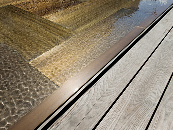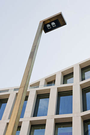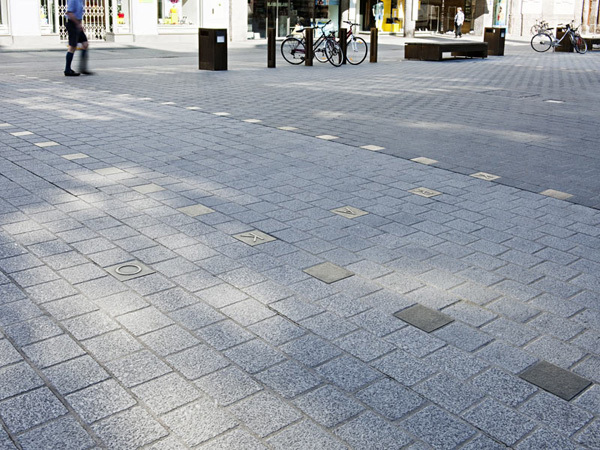 Two defining materials, granite and brass, balance these dualities in the redesigning: a slab carpet of four different types of granite creates a coherent square surface, and a network of brass-colored ground plates with street furniture growing up from it defines the square area proper in the middle of the street.