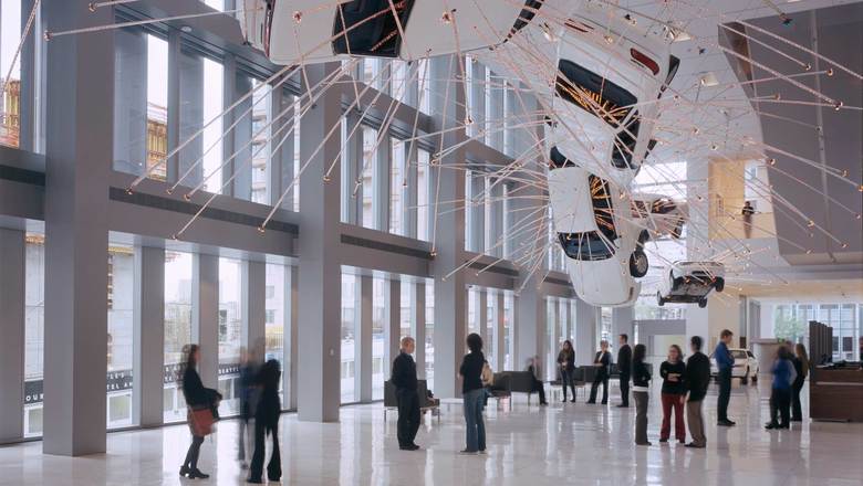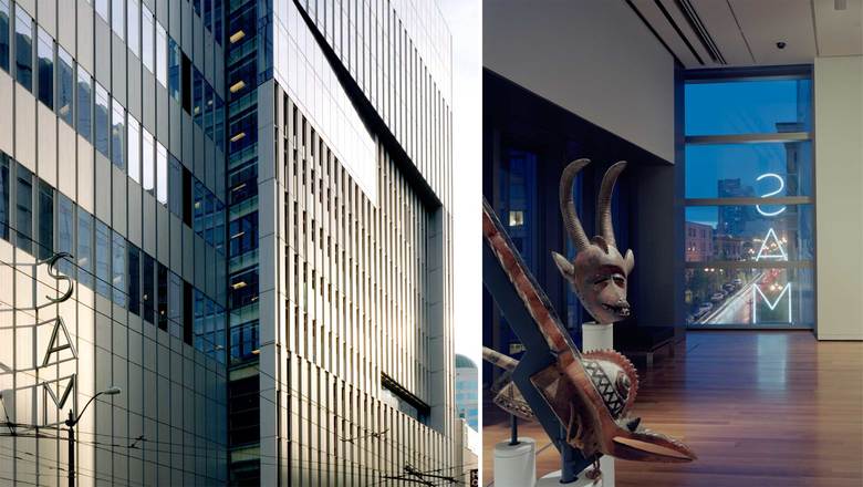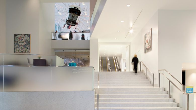 The new building sits on First Avenue overlooking Elliott Bay. It is primarily a western prospect, with views extending to the Olympic Range. Four exterior “shells” form the boundary of the building and site, each responding to a particular orientation. Their surfaces of flush glass, fixed and operable stainless steel panels engage varied light – filtering, reflecting, and diffusing it into the exhibition spaces. At the street, the museum is open and transparent, providing glimpses into the galleries from the sidewalk below. Rising through the lobby, the exhibition spaces are defined by parallel structural walls that filter light and provide views deep into the center of the block. These walls create rooms of varied proportion and height, providing a broad spatial palette for the curators and the collection. The museum is ordered by an internal landscape of double-height galleries that intersect exhibition floors above, drawing the eye further up into the heart of the museum. The expansion is an open field for vertical growth, both lens and filter for a shifting series of relationships with art and landscape.