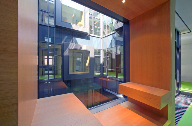 Fassade – Eine hinterlüftete Vormauerschale in Klinker prägt die äußere Erscheinung der großen Neubauten von Labor- und Tierhaltungsgebäude. Dieser in der Region traditionell stark verbreitete Baustoff ist sowohl kulturell und handwerklich als auch visuell vertraut. Er besitzt die Fähigkeit, über einen ausgesprochen langen Zeitraum und über alle Jahreszeiten hinweg eine emotional positive und zugängliche Atmosphäre zu schaffen. Witterungseinflüsse und das stetig wechselnde Licht auf Riems beeinflussen seine optische Erscheinung. Es entsteht ein Dialog mit dem Kontext, mit der Natur wie auch mit den bestehenden Klinkerbauten. Dies generiert eine starke Verwandtschaft der Architektur mit der Institutslandschaft und der natürlichen Verortung auf der Insel. Zudem ist das Material enorm widerstandsfähig und insofern auch eine schlüssige Antwort auf die exponierte Lage an der See. Das Thema von Weite und Dichtheit des Masterplanes wird mit dem Klinker bis an das kleinste Bauelement - dem einzelnen Stein - weiter getragen. Aus der Distanz wirkt die Fassade ruhig, klar und homogen. Die einzelnen Steine werden nicht bewusst wahrgenommen, die Flächen verfügen jedoch über eine lebendige und tiefenwirksame Ausstrahlung. Nähert sich der Betrachter dem Gebäude, werden die einzelnen Steine Schritt für Schritt besser sichtbar. Dies schafft Vertrautheit und verleiht den großen Gebäuden über diesen kleinsten Baustein eine menschliche Maßstäblichkeit. Die verglasten Fassaden im Erdgeschossbereich der „Inneren Straße“ reagieren komplementär auf die Lochfassaden auf der Außenseite der Gebäude. Sie begegnen der räumlich dichten Situation mit Offenheit und Transparenz. Die Wand existiert als Thema nicht, das Glas wird - von der ausschließlich technischen Funktion befreit - zum gestalterischem Element. Dabei spielt der hohe Grad an Transparenz auch eine große Rolle im Sicherheits- und Kommunikationskonzept. Analog zum Phänomen der maßstäblichen Wirkung des Klinkers wird mittels der Einteilung und Proportionierung der Gläser der enormen Länge der Gebäude von 230 m ein menschlicher Maßstab entgegengesetzt. So sind die bewusst gewählten Formate der Gläser Abbild eines Proportionierungssystems analog der Fibonacci-Reihe, welches sich über die ganze Länge der Fassade entwickelt. Die Farbgebung der Glasscheiben leitet sich aus der Analyse der Farbpalette des Kontextes ab. Die Sichtbetonoberfläche der „Inneren Straße“ dient dabei als Leinwand und Projektionsfläche für die farbigen Schatten der Gläser und wird zum räumlich erlebbaren Ort für die sich täglich verändernde Einwirkungen von Licht und Wetter.