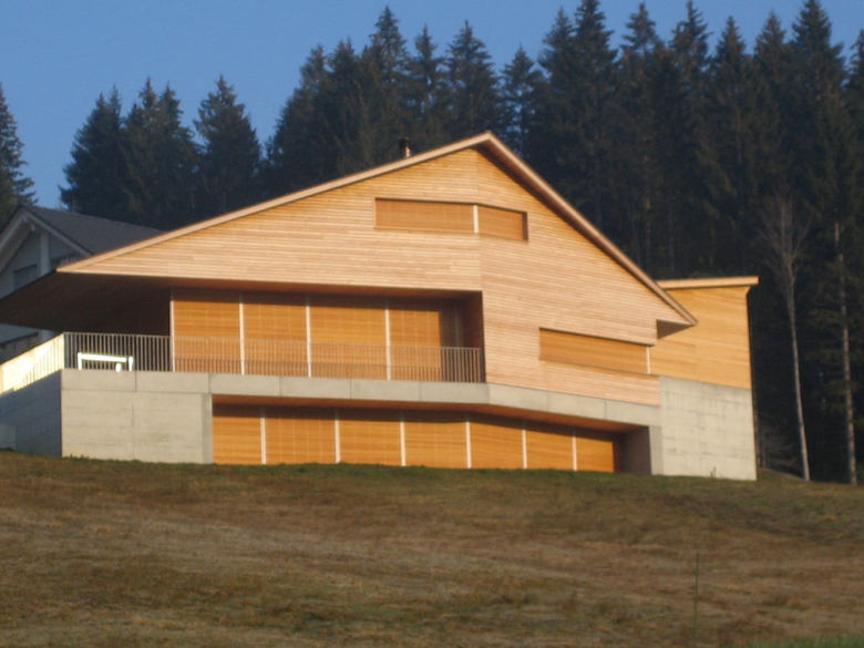 Die Zimmer im Untergeschoss sowie die Wohnräume im Erdgeschoss sind durch die grossen Fensterflächen mit viel Licht durchflutet und bieten eine fantastische Aussicht über das Tal. Die stützenfreie überdachte Terrasse mit einer Auskragung von vier Metern war eine statische Herausforderung für Architekt, Ingenieur und Zimmermann, die in guter Zusammenarbeit gelöst wurde.