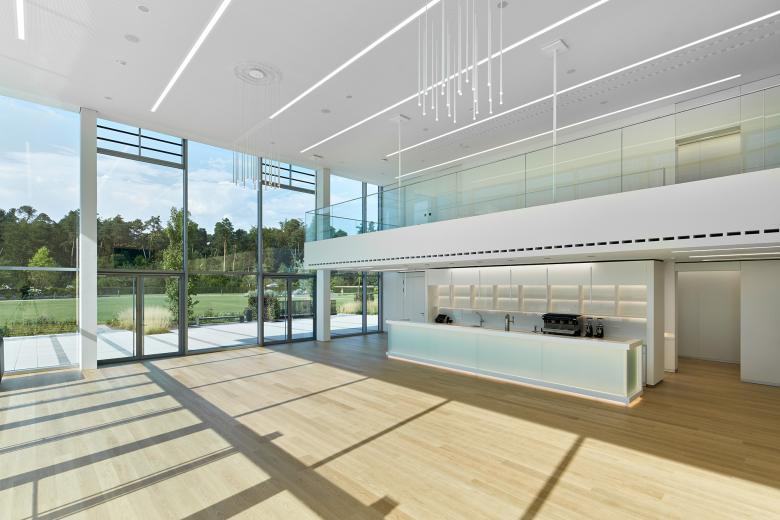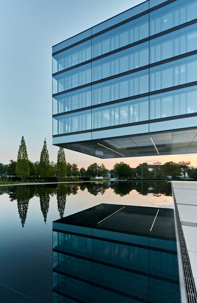 Neubau eines energieeffizienten Gesamtensembles, bestehend aus Firmenzentrale mit 112 Meter langer Auskragung sowie Wasserbecken vor dem Entrée, Bildungsforum area3, Parkhaus und einer sechs Hektar großen Parklandschaft