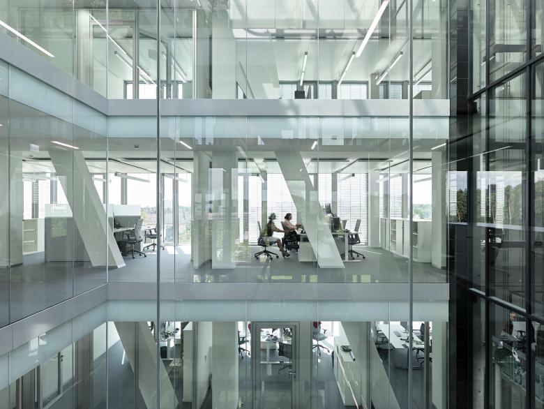 Die neue Zentrale besteht aus einem zweigeschossigen Sockelgebäude mit Eingangshalle, Restaurant und Konferenzbereich sowie vier gläsernen Bürogeschossen und einem Staffelgeschoss. Die Auskragung ist ein prägendes Element der Gesamtkomposition. Sie wird über zwei viergeschossige Stahlfachwerkträger realisiert, die in den massiven Gebäudeteil zurückgehängt werden und im Gebäudeinneren ablesbar sind.