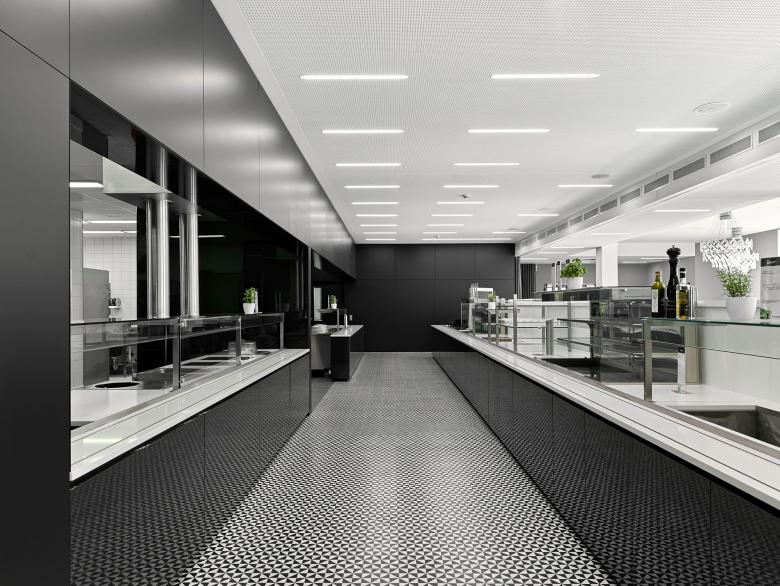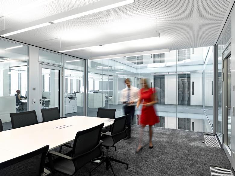 Eine Doppelfassade mit 8,10 m breiten und 3,20 m geschosshohen Scheiben sorgt für ein ruhiges, homogenes Bild nach außen, Schallschutz und Vortemperierung der natürlichen Luftzufuhr. Zwei integrierte verglaste Lichthöfe bringen natürliches Licht in das Gebäudeinnere. Dank der Zweiachsflexibilität und dem Achsraster von 1,35 m sind alle Bürokonfigurationen möglich. Großzügige Kommunikationszonen mit Teeküchen im Norden und Süden bieten Raum für Austausch und Inspiration. Ein dezentrales hybrides Lüftungskonzept mit Kühlsegeln und Fassadenlüftungsgeräten sowie der Einsatz von Photovoltaik, Holzpelletkesseln und Zisternen ist Teil des innovativen Energiekonzeptes und ermöglicht eine nachhaltige und angenehme Aufenthaltsqualität. Der MHK-Campus wird durch ein großzügiges Parkhaus ergänzt.