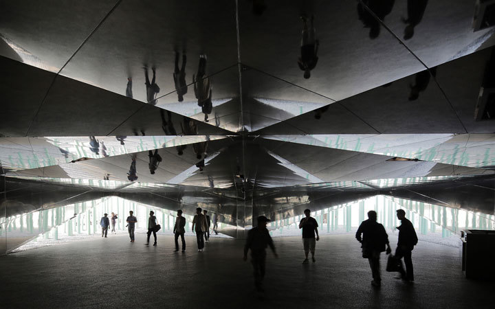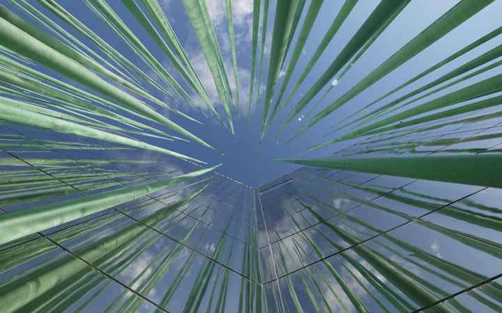 Symbol of energy: At the Expo Korea the corporate pavilion of GS Caltex, a Korean oil corporation, illustrates the company's mission and its visions for the future. The pavilion architecture is presented as a dynamic ensemble which, at first glance, is reminiscent of an outsized rice field. Eighteen metres high, so-called blades sway like grass in the wind. Touching activates individual sensitive blades and illuminates them. A centrally located star-shaped, mirrored pavilion building is optically withdrawn in its entirety. Via raised corners of the star, the visitor can gain access to the also mirrored entrance area on the ground floor. The centre of the pavilion is on the upper floor; a seven-metre-high round room with panoramic projection. Poetic images in a reduced black-and-white aesthetic convey the company's readiness to assume responsibility with regard to sustainable energy concepts.