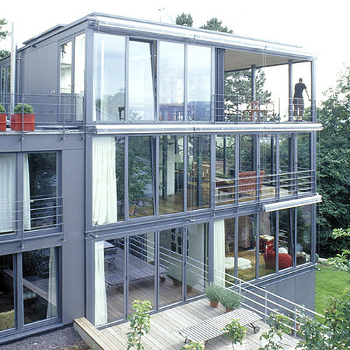 The topographical parameters of the site inspired the design of a four-story structure. The goal was to achieve a harmonious design solution with a minimum of physical intervention in a site that has a height variance as great as eight meters. The transparency of the glass facade with its fold and slide elements offers the possibility of a balcony-like opening on the upper two levels. Contrary demands like transparency and shelter, modernism and timeless design, family needs and individuality are expressed by this unobtrusive building.