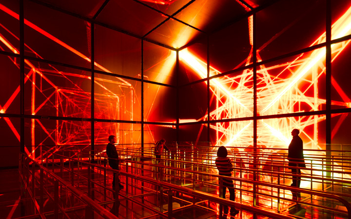 Technical impulses are emitted from there, which enclose the entire building complex with power-charged grid lines. The visitors of the Magic Box are immersed in a spatial installation that becomes an emotionally charged experience. A tight grid of LEDs on the inner walls of the 15 meters high cube allows a room to be contrived by light effects, enclosing visitors on six sides. In striking images, the film conveys the company’s responsibilities and visions: the responsible supply of an solid national grid, that leads to improvements in living conditions in cities.