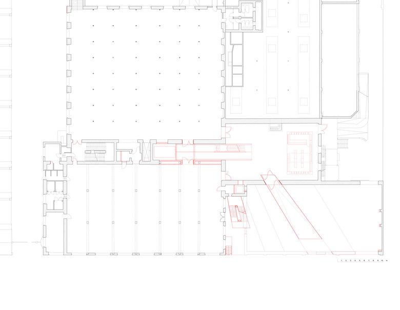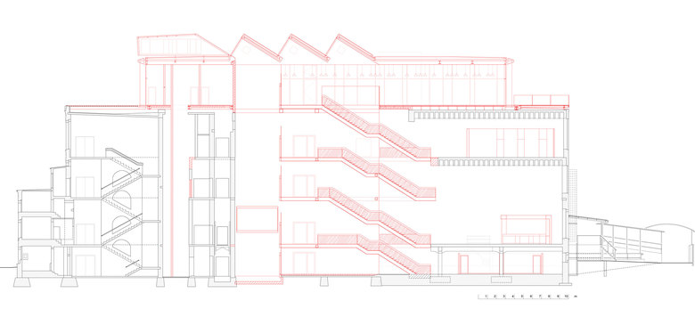 "Reanimate and reinvent" were the maxims. The concept thus underlined the original functional interrelationships of the factory by means of careful architectural surgery. The language of form and colour are derived from the old building structure. The new installations are optically offset and add a time layer of equal value to the old still existing features, which can be experienced as historical markers with all the traces of their former use.