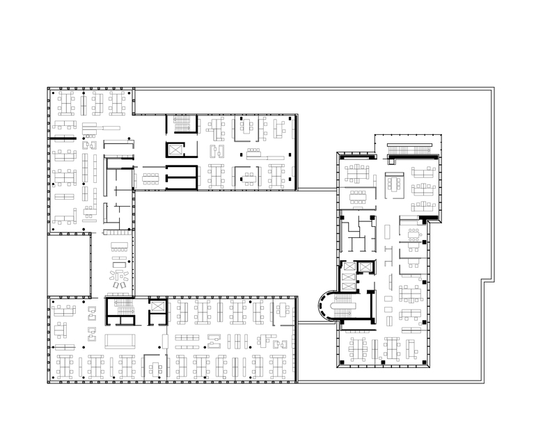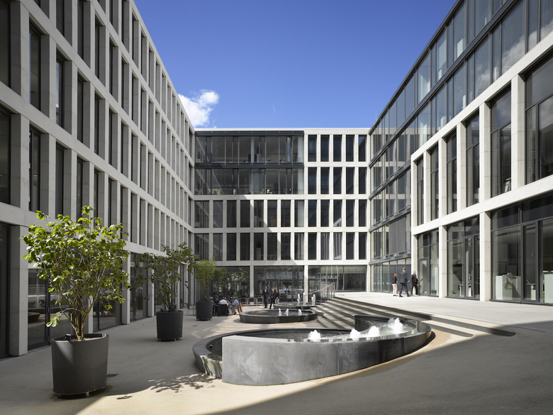 The perimeter blocks of the extension restructure the headquarters' site and turn the orientation of the Kreissparkasse (district savings bank) towards the city center. Being the final point of the city's north-south axis, the square in front of the station is remodeled. The vertically structured stone façade joins the new buildings with some of the existing ones. By reducing its sculptural presence, the tower, built by Paul Stohrer in 1974, becomes part of the newly formed quarter. The headquarters in Göppingen is certified Gold by the DGNB (German Sustainable Building Council), making it the first Kreissparkasse to win this distinction.