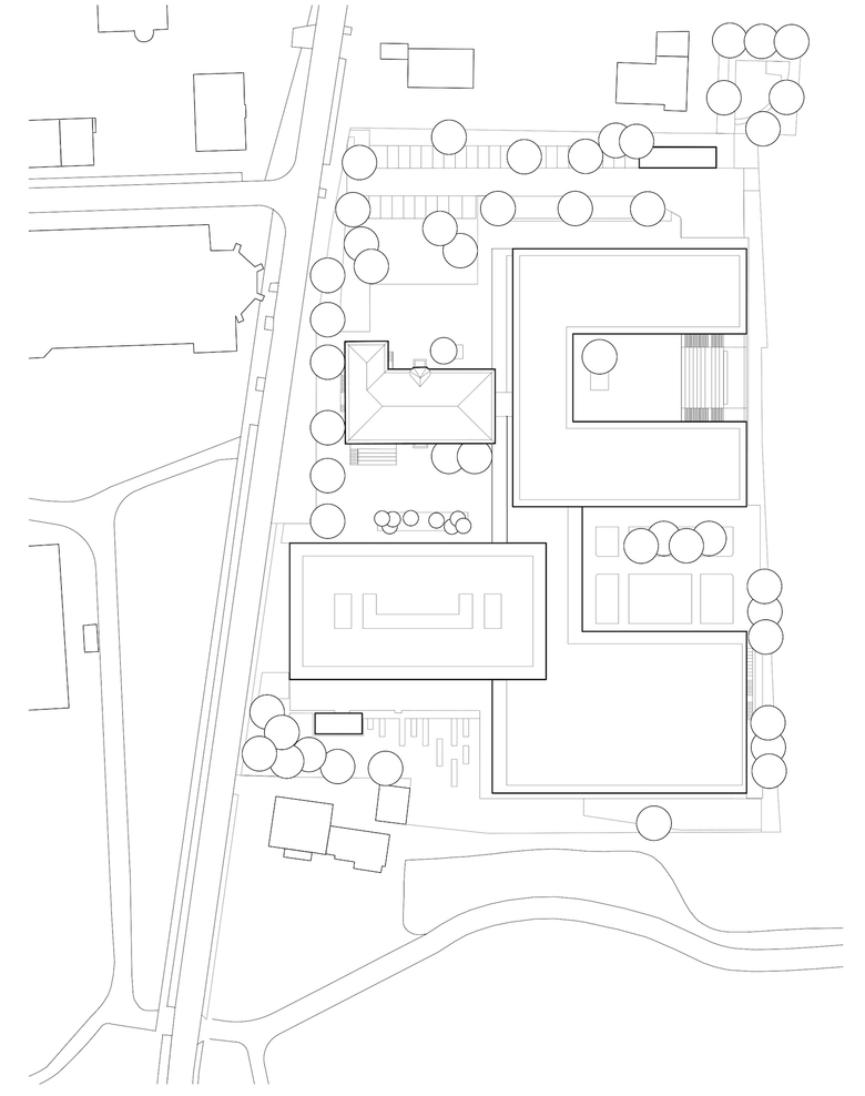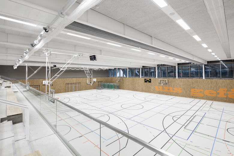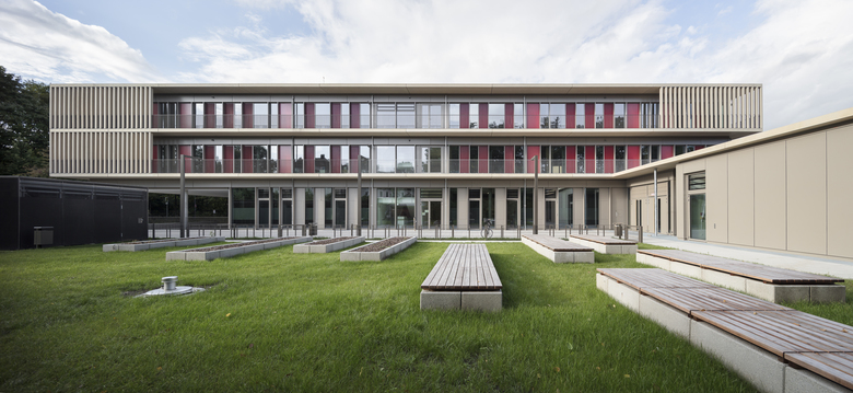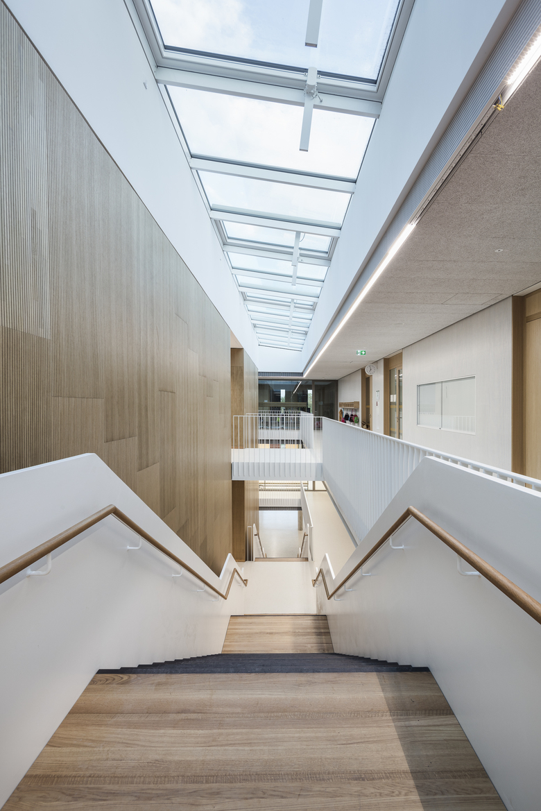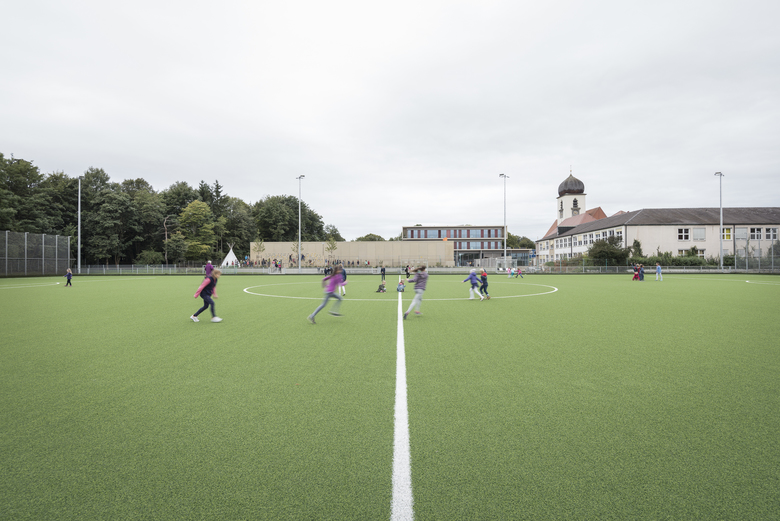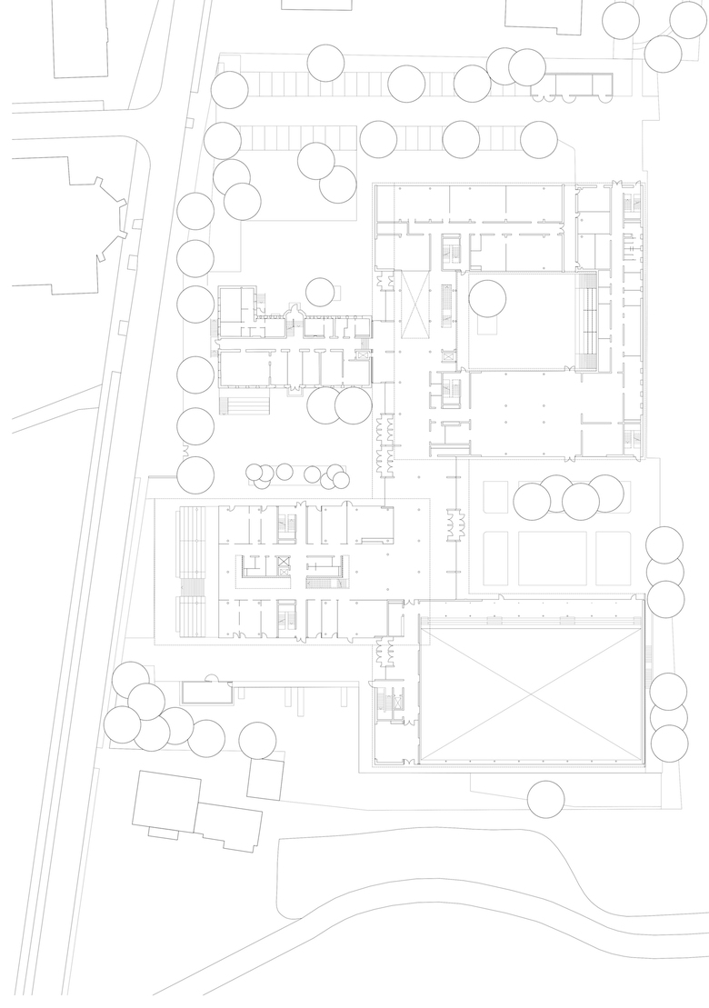 The existing school buildings, dating from various periods, were demolished, except for the main building from 1912, standing opposite the Church of the Passion of Christ. They are substituted by new buildings, comprising a grammar and a high school as well as a sports hall, which can be divided into three pitches. They are connected by a lobby on ground level, with access to the school buildings, the cafeteria, and the sports hall respectively. In this way, apart from a generous entrance court, protected schoolyards, partly stretching over two levels, are created.
