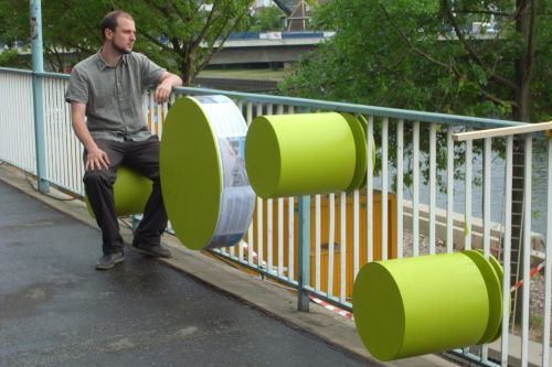 Ziel des Entwurfs ist es, einen wiedererkennbaren Marker im öffentlichen Raum zu schaffen, der als auffälliges, unverwechselbares bauliches Objekt unter dem Motto " Die Baustelle als Schaustelle" Auskunft über das große Stadtentwicklungsprojekt "Stadtmitte am Fluss" geben soll. Der Entwurf basiert auf dem Siegerentwurf eines regional ausgelobten Studentenwettbewerbs, der hier gestalterisch und konstruktiv weiterentwickelt und zur Ausführungsreife gebracht wurde. Als Fachberater konnte Prof. Lutz Pankow von der Hochschule für bildende Künste Hamburg gewonnen werden. Der Infopoint soll im Rahmen des Projektes an verschiedenen Stellen der Landeshauptstadt Saarbrücken temporär eingesetzt werden. Dazu sollen vorhandene Elemente des öffentlichen Raums wie Brückengeländer, Treppenanlagen, Baustellenzäune oder Gerüste als statische brauchbare Träger verwendet werden, an die wie kleine Parasiten feste und drehbare Zylinder, die als Sitzgelegenheit und Informationsträger dienen, angebracht werden.