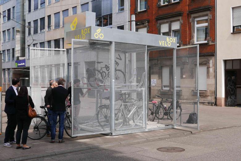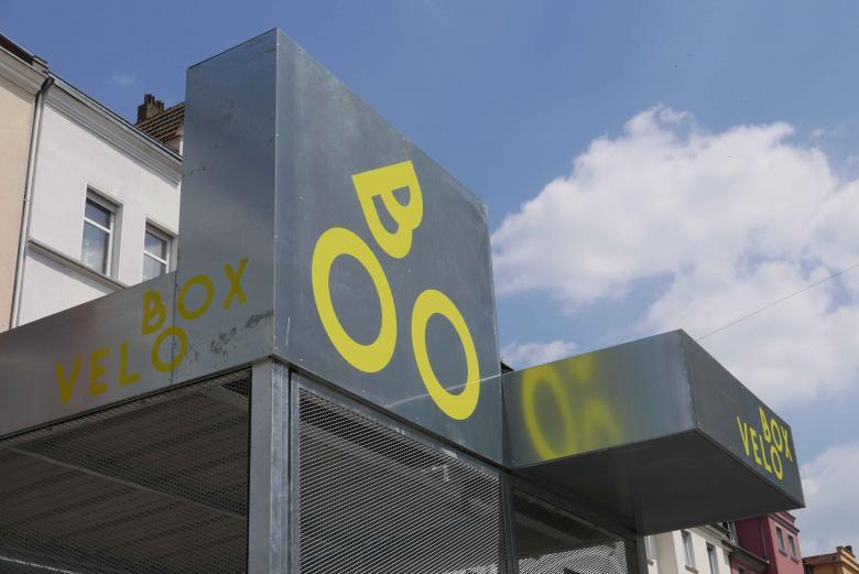 Die VeloBox wurde prototypisch für den saarländischen Landesverband des Allgemeinen Deutschen Fahrrad-Clubs (ADFC) auf Anregung von und in Zusammenarbeit mit einer Anwohnerinitiative entwickelt. Herausgekommen ist eine robuste abschließbare Abstellanlage und Serviceeinrichtung für den Radverkehr, die flexibel und ohne jegliche Fundamentierung im öffentlichen Raum aufgestellt werden kann. Die Grundkonstruktion aus schlanken Stahlrohren kann mit unterschiedlichen Bekleidungen auf örtliche Randbedingungen angepasst werden. Innen finden bis zu zehn Fahrräder auf zwei Ebenen Platz. Über eine seitliche Tür können im rückwärtigen Teil ein Lastenrad oder mehrere Fahrradanhänger untergebracht werden. Für die Nacht verfügt die Velobox über eine solar gespeiste Leuchte mit Bewegungsmelder. Der modulare Aufbau ermöglicht ebenso eine problemlose Erweiterbarkeit. Durch die Verlängerung um eine Achse in die Tiefe, kann die Velobox bereits zwanzig Fahrräder aufnehmen. Das grafische Erscheinungsbild baut auf einer typografischen Wortmarke auf, die erst auf den zweiten Blick ein Fahrrad sichtbar werden lässt. Der spielerische Umgang mit Wort und Bild sorgen für Sympathie, die reduzierte Grafik durch ihre Prägnanz für Sichtbarkeit und einen hohen Wiedererkennungswert. Mit der Farbe Schwefelgelb entsteht ein leuchtend warmer Kontrast zur technisch-kühlen Anmutung des Materials und bildet eine Analogie zu den Fassaden der Umgebung.