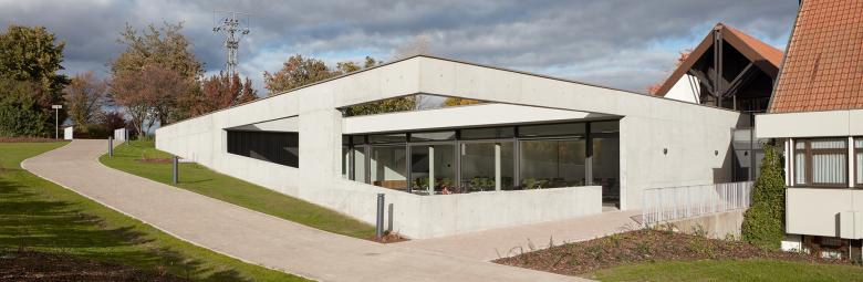 Das Haus Maikammer, ein Schulungszentrum der Berufsgenossenschaft Rohstoffe Chemie und Industrie, musste erweitert werden. Das Haus liegt in der sanft hügeligen Landschaft der Vorderpfalz in Mitten von Weinreben mit Blick auf den malerischen Haardtrand. So werden die Ausläufer des Pfälzer Waldes genannt. Das bestehende Ensemble aus Unterrichtsräumen, Hotel und Gastronomie ist in sich geschlossen und nicht auf Erweiterung angelegt. Die einzig mögliche Stelle einer für die innere Organisation sinnvollen Erweiterung ist durch einen steilen Hang geprägt. Die Lösung musste sein, das Gebäude in den Hang zu bauen, was wiederum den Vorteil hat, dass die Erweiterung im Gelände verschwindet und nicht in Konkurrenz zum Bestand tritt. Aber wie belichtet man ein Gebäude, das im Hang steckt? Es muss sich den Raum für die Belichtung selbst schaffen durch das Einschneiden von Lichthöfen in den Hang, über die die Seminarräume und Büros belichtet werden können. Die Erweiterung tritt so nicht als Gebäude in Erscheinung, sondern als Landschaftsbauwerk, das mit dem Bestand nicht konkurriert, sondern in dieser Ortsrandlage kaum wahrnehmbar ist. Es passt sich in die sanfte Hügellandschaft der Vorderpfalz ein und wird durch das begrünte Flachdach gleichsam Teil davon. Die Wahl von Beton als Material für die Außenhülle ist eine logische Konsequenz aus dem Ansatz, das Gebäude als Landschaftsbauwerk zu entwerfen, das sich in den Hang gräbt. Aus konstruktiver und abdichtungstechnischer Sicht ist Beton das sinnvollste und wirtschaftlichste Material. Der Anschluss an den Bestand erfolgt barrierefrei über einen verglasten Übergang, der wie Fuge zwischen Bestand und Erweiterung wirkt. Man verlässt den Bestand und betritt den neuen Teil also nicht unbemerkt. Der Neubau wird durch die Orientierung der Seminar- und Büroräume zu den beiden Höfen, die jeweils in entgegengesetzte Himmelsrichtungen ausgerichtet sind, ganz automatisch in zwei funktionale Zonen gegliedert: in den Seminarbereich und in den Bürobereich. Die Höfe dienen neben der Belichtung gerade bei den beiden Seminarräumen als Erweiterung nach außen im Sinne einer Freiklasse. Dabei wird der Blick auf die Landschaft durch den oberen Balken gerahmt wie bei einem Gemälde.