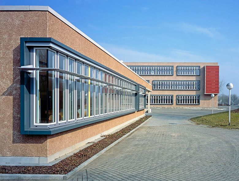 An einen vorhandenen Flur, der bisher nur einspännig genutzt wurde, sind nun ein Büro, ein Schülervertretungsraum und ein Aufenthaltsraum angegliedert. Zusammen mit einer überdeckten Pausenfläche, die den zweiten Zugang formuliert, und dem Werkraum mit angeschlossener Klasse bildet dieser Eingriff den zweiten Bauabschnitt. Zwei Raumerweiterungen im Bereich der Werkstätten schließen die Maßnahme ab.