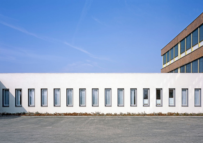 Städtebaulich komplettiert die Erweiterung die bestehende Berufsschule von Montabaur. Ihre Typologie, eine Hof-Bauweise, wird wieder aufgenommen und bildet nun auch auf der Talseite den Wechsel von Klassentrakt - Hof -Klassentrakt aus, wie sie bereits auf der Hangseite existiert.