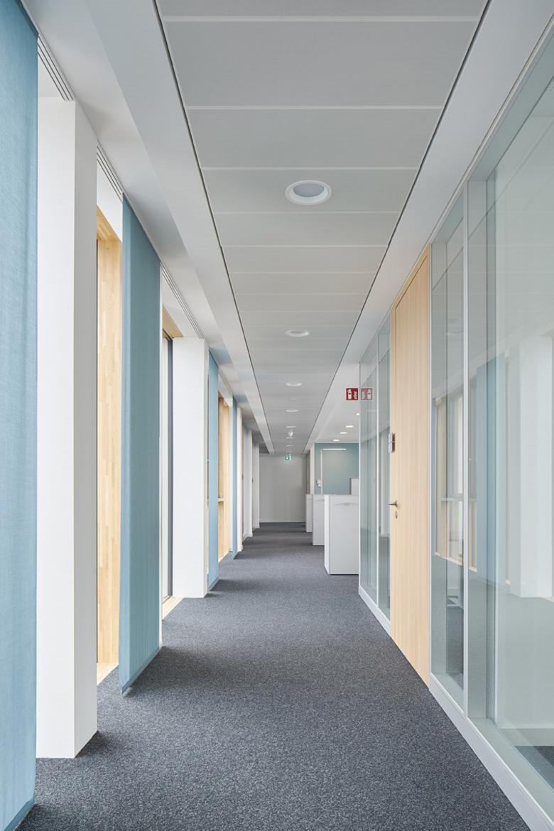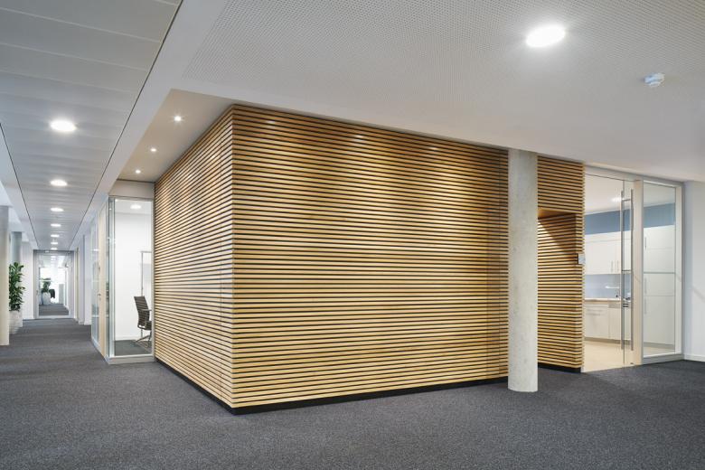 Durch den Abriss von 2 Gebäuden wurde der Weg frei das Erschließungskonzept grundlegend zu überarbeiten. Statt der bisher 5 Erschließungskerne und frei im Grundriss verteilten diversen WC-Anlagen gibt es nur noch 3 Erschließungskerne mit angeschlossenen WC-Anlagen. Sie sind im Grundriss optimal verteilt. Sie liegen an Brandwänden und in nicht zu belichtenden Bereichen. Es lassen sich pro Geschoss bis zu 7 Einheiten verschiedenster Größe erschließen, die WC-Anlagen liegen übergeordnet dem Treppenhaus zugeordnet und können von allen Einheiten benutzt werden. Durch diese Maßnahme erhält man einen großen zusammenhängenden völlig freien Grundriss, der sich nach Belieben einteilen lässt. Die Struktur ist äußerst flexibel. Von Zellenbüros über Kombibüros bis zur offenen Arbeitslandschaft kann alles gestaltet werden. Das Bürorastermaß von 1,25 m unterstützt diese Flexibilität.