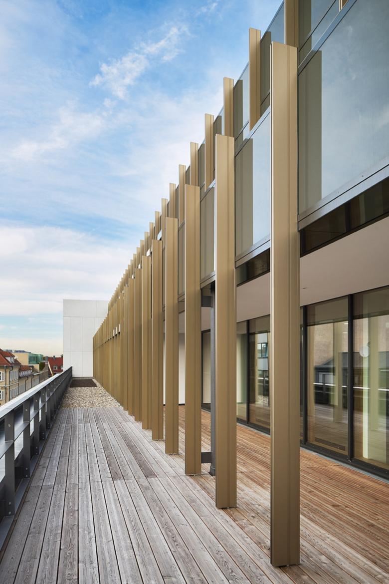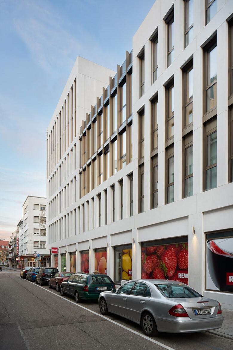 Durch die weiße Betonfassade, die aus geschosshohen Faserbetonelementen besteht, erhält das Gebäude das nötige Gewicht um die unterschiedlichen Fassaden entlang der Kaiserstraße zusammenzubinden und zu fassen. Die elegante Steinfassade des Bestandes aus den 50ern mit seiner vertikalen Gliederung diente als Vorbild. Zusammen mit diesem Bestand bildet die neue Fassade einen Rahmen für die dazwischenliegende Glasfassade mit ihren tiefstehenden Pfosten aus eloxiertem Aluminium. Beherrschend in der neuen Ansicht sind die stehenden Formate, die dem Bau seine zeitlose Eleganz verleihen. Mit durchlaufenden Pfeilern werden in einigen Bereichen 2 Geschosse zusammengefasst. Die Fassade erhält dadurch eine zusätzliche Gliederung. Die Einschnitte entlang der Hirschstraße markieren besondere Punkte, zum einen die Durchfahrt in den Hof, zum andern die Einleitung in die Kaiserstraße. Durch den Einschnitt an dieser Stelle wird der Kopf ausgebildet und turmartig erhöht. In der verkürzten Perspektive der engen Hirschstraße ziehen sich die schmalen vertikalen Formate der Betonfassade zu einer wandartigen Struktur zusammen, in denen goldschimmernden Flächen eingearbeitet sind, die sich aus den tiefstehenden eloxierten Aluminiumpfosten zusammensetzen. Nach oben lösen sich die Pfosten auf und schweben wie eine Krone über dem Bau.