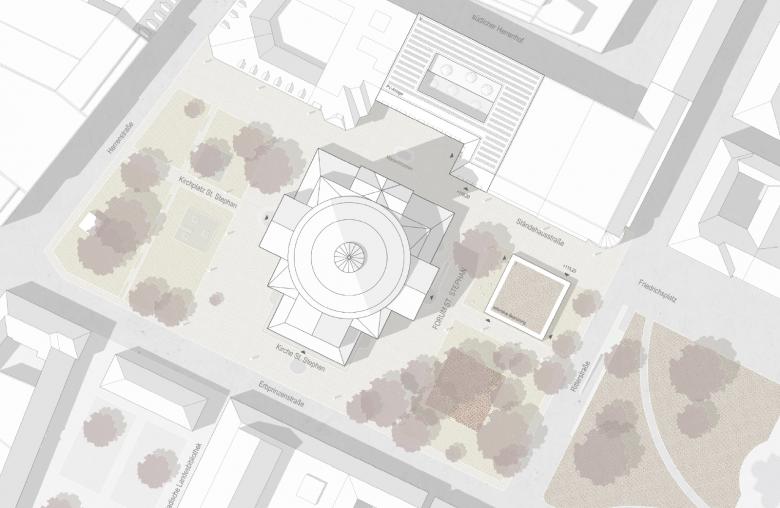 Für diesen Entwurf haben wir den Arbeitstitel Raum für Sichtbarkeit gewählt, um den oben beschriebenen Problemen zu begegnen. Zum einen sind wir der Überzeugung, dass mehr öffentlicher Raum und weniger Gebautes das Wesentliche sichtbar macht die Kirche St. Stephan. Zum anderen entsteht durch das Mehr an öffentlichem Stadtraum vor der Kirche Platz für Neues. Dieser Platz wird mit einem Raum für Sichtbarkeit besetzt, einem Möglichkeitsraum mit leichter transparenter Hülle, geborgen unter einem schweren Dach, das sich wie eine schützende Hand