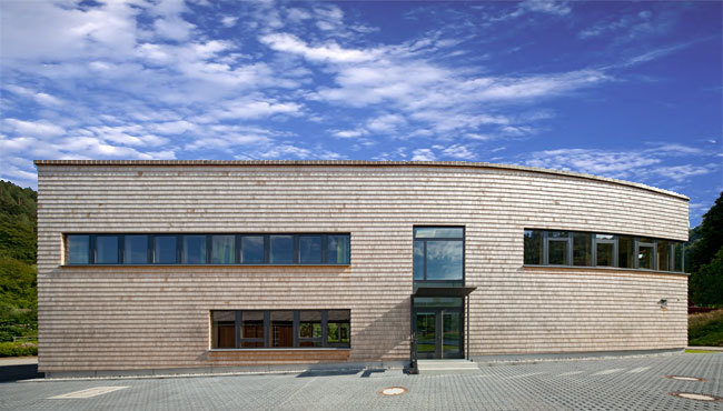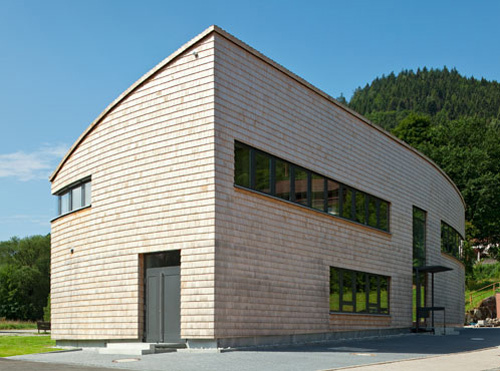 Das zweigeschossige Gebäude ist auf allen Seiten mit Schindeln überzogen, wie sie im Enztal typisch sind. Neben dem Witterungsschutz gliedern sie das Gebäude hervorragend in die ländliche Umgebung ein. Durch die leicht verzogene Grundform und die vollflächige Schindelbekleidung lässt sich nicht mehr in Fassade und Dach unterscheiden, sondern die Hülle wird als Ganzes wahrgenommen – das Gebäude wirkt in seiner Großform wie die alten landwirtschaftlichen Nutzgebäude.