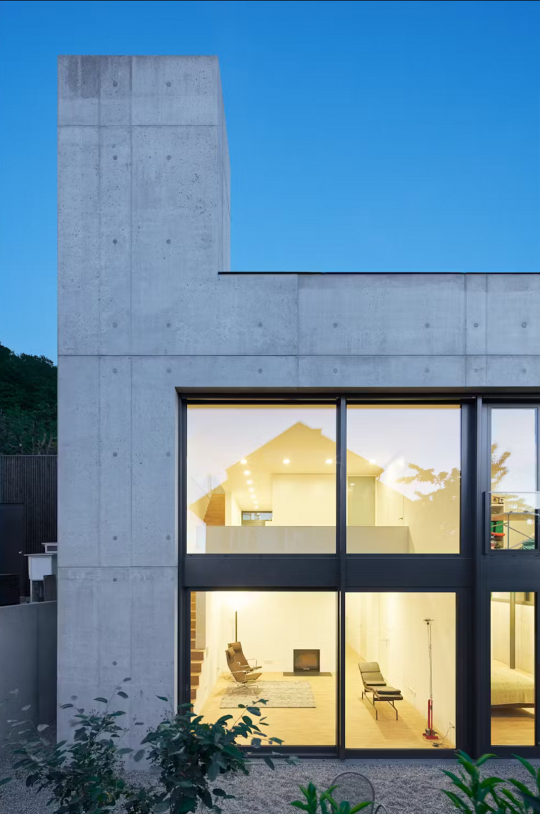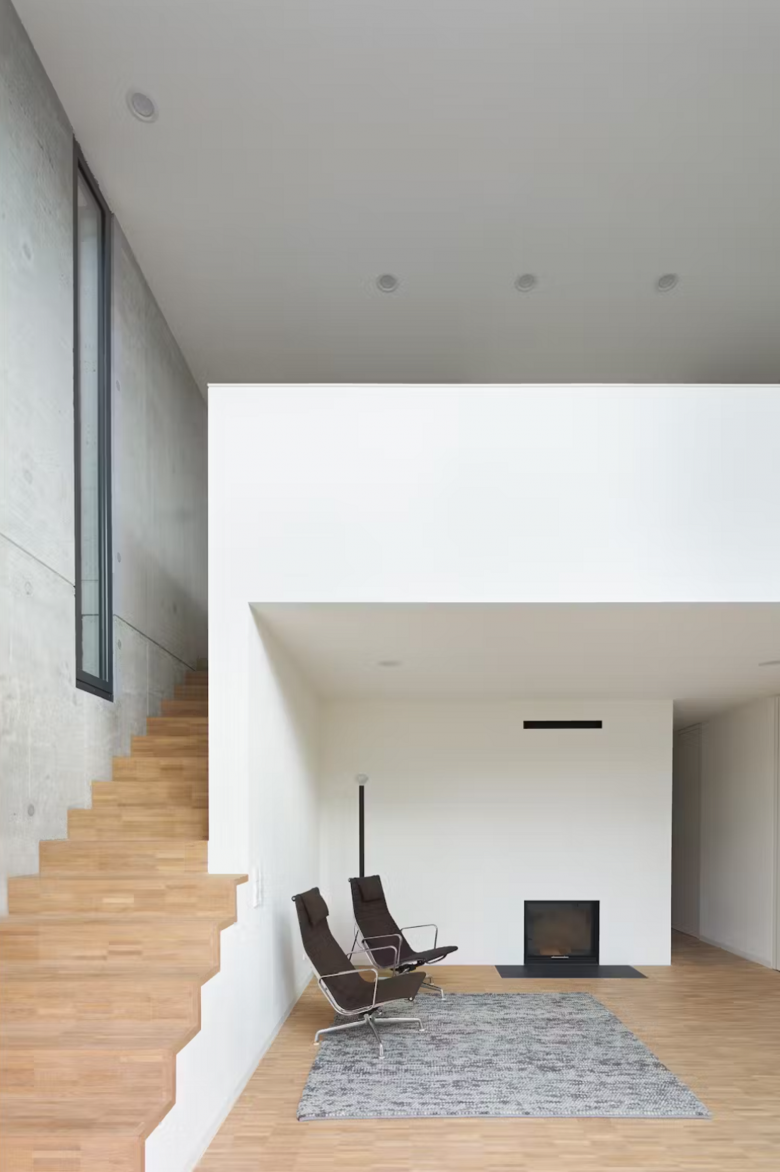 Da das Grundstück in Folge der Nachverdichtung eher klein ausfiel und die weite Aussicht aufgrund der Hanglage erst im Obergeschoss erlebbar wird, wurde der Grundriss ganz aus der besonderen Situation entwickelt. Die Küche mit dem Essbereich liegt im Obergeschoss, es schließt sich eine große Dachterrasse mit Außenkamin an, um den Panoramablick zu inszenieren. Im Gartengeschoss liegen das Wohnzimmer mit Zugang zum Garten und das Elternschlafzimmer, im Erdgeschoss der Eingang und die weiteren Privaträume. Die drei Geschosse werden durch eine einläufige Treppe und über einen großen Luftraum räumlich miteinander verbunden.