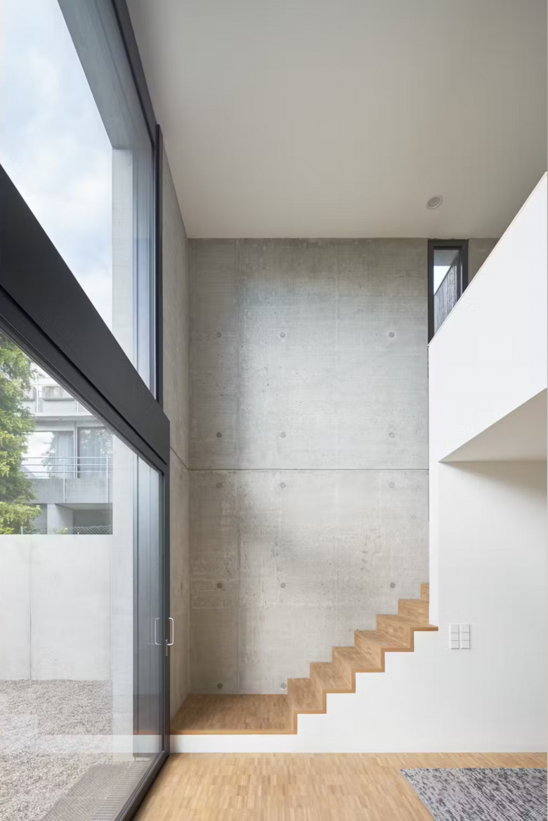 Alles bleibt sichtbar, bei der Außenwand wie auch im Innern, es gibt keinen Putz und keine Farbe, das Material gibt die Farbigkeit vor. Die Innenwände setzen sich klar von den tragenden monolithischen Außenwänden ab, sie sind konventionell gemauert, mit Kalk verputzt und weiß gestrichen. So prägt auch die samtige Betonoberfläche der Außenwand den Innenraum.