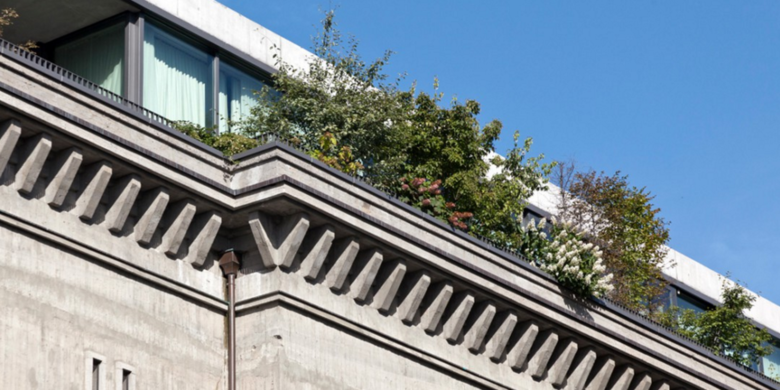 Die Gestaltung der Dachflächen sieht eine Fortführung der Räume des Penthouses in den Außenruam vor. Die Räume mit ihren spezifischen Nutzungen wie Lounge, Wohnzimmer, Badezimmer werden in den Außenraum fortgeführt. Die außenliegenden Wohnbereiche werden durch üppige Gärten begrenzt. Eine räumliche Gliederung der umlaufenden Freiflächen wird erzeugt. Semitransparente Paravents aus Hainbuchen nehmen die Fluchten der Fensterpanele auf und bilden die grünen Wände der Terrassen.