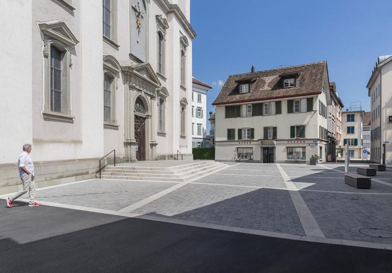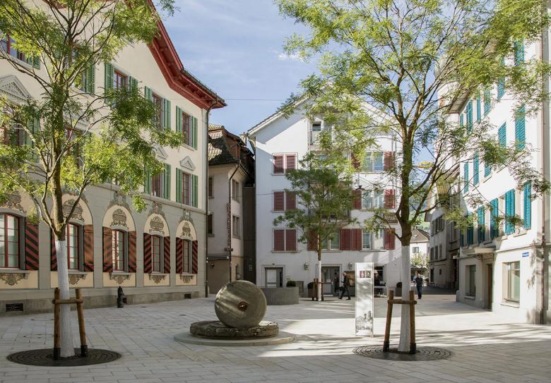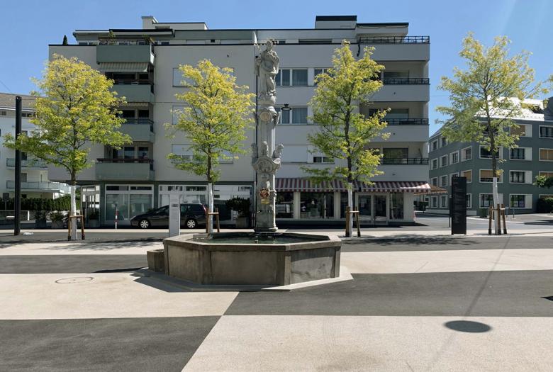 Die drei wichtigen Dorfplätze Rathausplatz, Kirchplatz und Kreuzplatz, welche bisher vom motorisierten Verkehr eingenommen wurden, werden wieder zu Plätzen für Menschen. Sie orientieren sich in Ihrer individuellen Gestaltung an der jeweiligen städtebaulichen Situation und örtlichen Besonderheiten wie den drei Brunnen oder historischen und religiösen Bezügen. Durch verwandte Materialien und Farben werden die Plätze in ihrer Zusammengehörigkeit gestärkt. Ein einheitlicher Asphaltbelag stärkt den räumlich spannenden Gassenraum zwischen der dichten und verwinkelten Bebauung des Dorfkerns. Anhand des neuen Verkehrsregimes entsteht ein koexistenter Strassenraum welcher in den Gassen mehr Raum für Begegnungen, fürs Einkaufen und Flanieren bietet. Prägnante Orte wie Kreuzungen und Aufweitungen im Gassensystem werden jeweils durch einen.