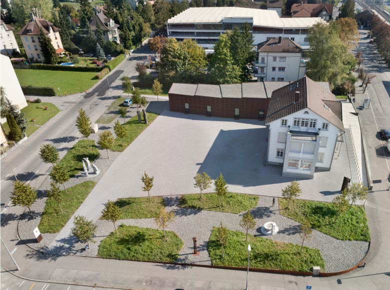 Die neue, dem Bahnhof zugewandte Eingangssituation klärt und verstärkt die öffentliche Bedeutung des ’Neuen Kunsthauses’. Die bestehende Gartenmauer entlang Bahnhofstrasse bleibt bestehen und wird durch eine Zugangstreppe mit Rampenanlage ergänzt, welche den Museumsvorplatz und den angrenzenden Park erschliesst. Die Parkanlage besteht aus öffentlichen, frei zugänglichen Bereichen bei welchen bewusst auf ein Wegenetz verzichtet wurde. Auf dem grosszügigen, allseitig gefassten Kiesplatz, stehen nebst dem Kunsthausensemble selbst, die Skulpturen in freier Anordnung. Eisenoxydfarbige Schotterbeete, mit Zierkirschen und Skulpturen besetzt, bilden einen räumlich definierten Ort, welcher auch vom Strassenraum ungehindert erlebbar wird.