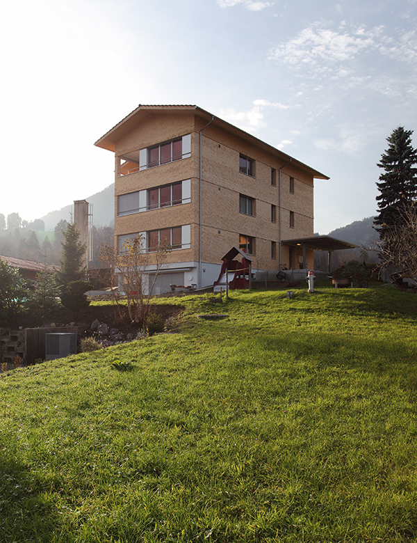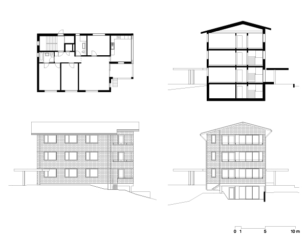 An der Siedlungsgrenze gelegen, kommt dem Gebäude eine vermittelnde Rolle zwischen ruralem Kontext (bergwärts) und heterogener Siedlungsstruktur (talwärts) zu. Seine klare Struktur und die Fassaden aus regionalen Fichtenschindeln schaffen einen für diesen Ort angemessenen, ruhenden Pol.