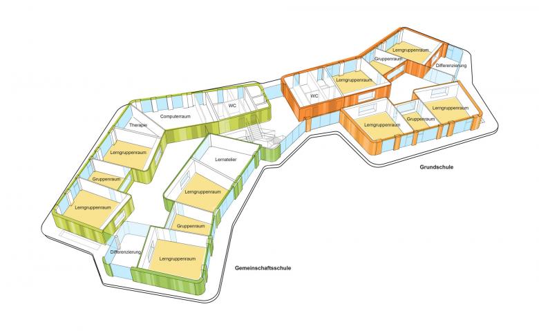 The elementary school is located on two stories in the northwest wing. In the southeast section, the community school occupies three stories for grades five through ten. The available space is organized into a variety of learning landscapes and open room structures that are designed to encourage communication, based on pedagogical theories about learning in an individualized, cooperative, and social manner. Classrooms, group rooms, and multipurpose rooms are combined in units, known as “learning houses.” Teachers can also maximize the sense of openness and transparency by holding classes in the adjoining access zones and in outside areas, which makes the entire building a livelier place. Wraparound terraces provide direct outdoor access. The distinctive color schemes on the walls give the individual learning houses an unmistakable character that helps generate a specific sense of identity. Intense orange, yellow, green, and earthy hues create a vibrant and stimulating mood. Haptic, warm, and high-value materials such as linoleum, wood-based products, and acoustic ceiling materials convey a feeling of well-being.