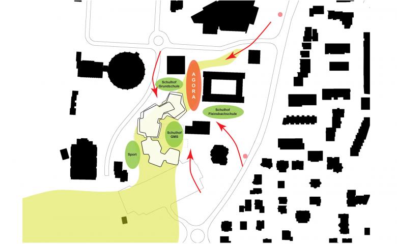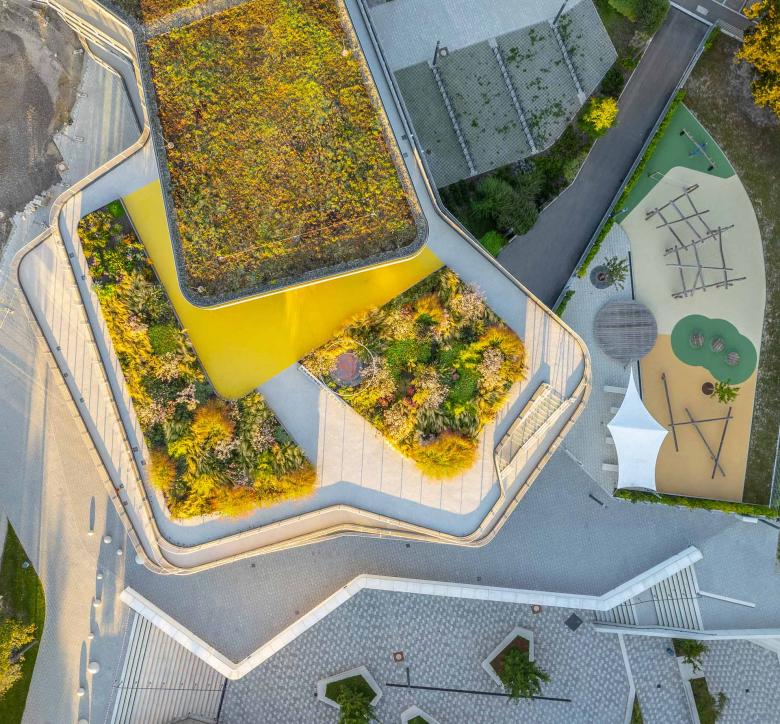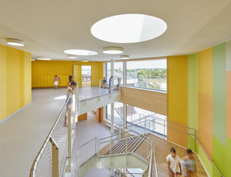 The building centers on the foyer, which acts as a meeting point and provides access to the cafeteria, the student library, classrooms for specific subjects, and rooms for teachers and school social workers. Twin entrance areas create a feeling of permeability, ensuring a clear connection to the space outside. The open atrium is suffused with light and unifies the structure vertically. The garden level opens up onto the Agora with a generous expanse of glazed areas. Different school yards with planted areas, outdoor spaces that merge into one another, and the Agora—a sunken courtyard with steps that just invite you to take a seat—are designed as landscape features that will promote community and enhance the relationship between the two schools.