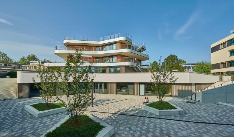The new school building with its free-flowing, organic design is confidently positioned at the heart of a heterogeneous setting. The horizontal lines and terracing running around each story give the structure a distinct individual character. The architectural concept envisioned the core idea of a vibrant school campus that encourages teachers and students to work together.