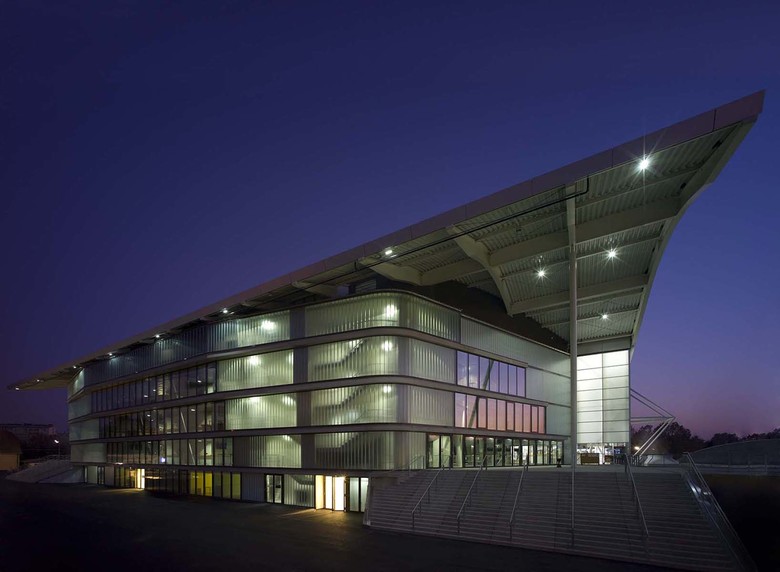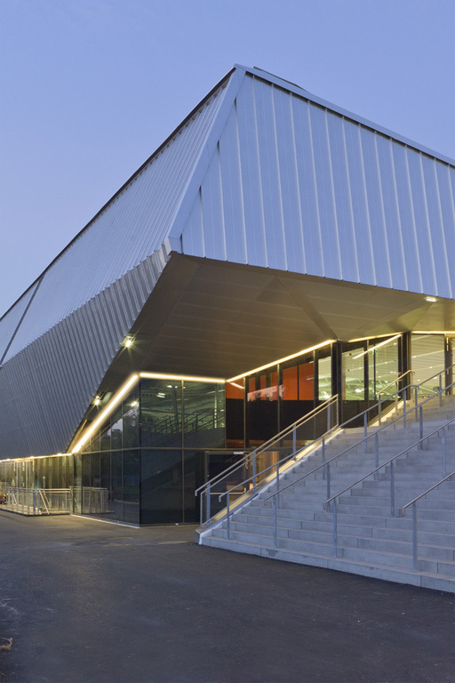 The huge structure of the three roofs effortlessly spans the three ice rinks. It creates a generous space for a “promenade architecturale” that permits a sequence of insights and perspectives into the stadiums and onto the fields where the action is taking place. The handling of light, transparency, materiality and construction forms a continuous architectural guideline, within which dissimilar atmospheres have been created.
