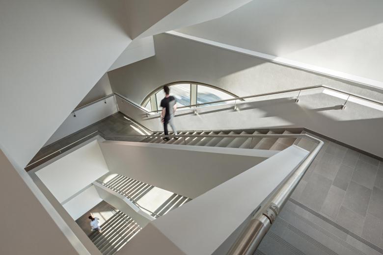 As with the Paracelsus Medical University (House C), the two main staircases are of great importance. In particular, the large staircase is planned as a three-dimensional communication space. All laboratories are located on the upper floors and determine the internal structure of the building with its functional, large corridor depths. Lecture and practice rooms as well as offices for scientific staff and administration complete the programme.