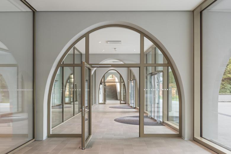Typologically, the ground floor resembles a three-aisled “basilica”, whereby the western row of columns follows the sloping line of the old ground boundary. Thus resulting in the entrance hall taking on a conical shape through a series of different arches. The conical course of the projection to the forecourt is also created. This small incline opens the strict system of the pillars and creates a formal connection to the architecture of the Paracelsus Medical University (House C). This dynamic is particularly emphasized by double-high arches in the area of the staircases, which make the transition from the pedestal to the floors legible from the outside.