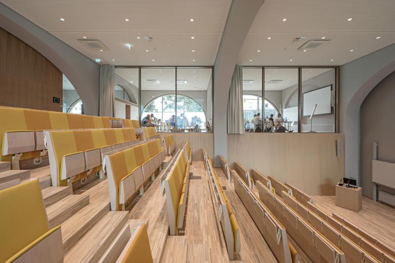 The idea of a semi-public basement floors is continued in the Institute of Pharmacy (House D) with the construction of the urban typology of a large columned hall. The centre of this large hall is an amphitheatre. Surrounded by glass walls, it forms the transparent heart of the building. The massive arches and pillars span the entire ground floor and connect the various areas of the auditorium, seminar rooms, foyer area and staircases. The glass walls allow all parts to merge into an open space.