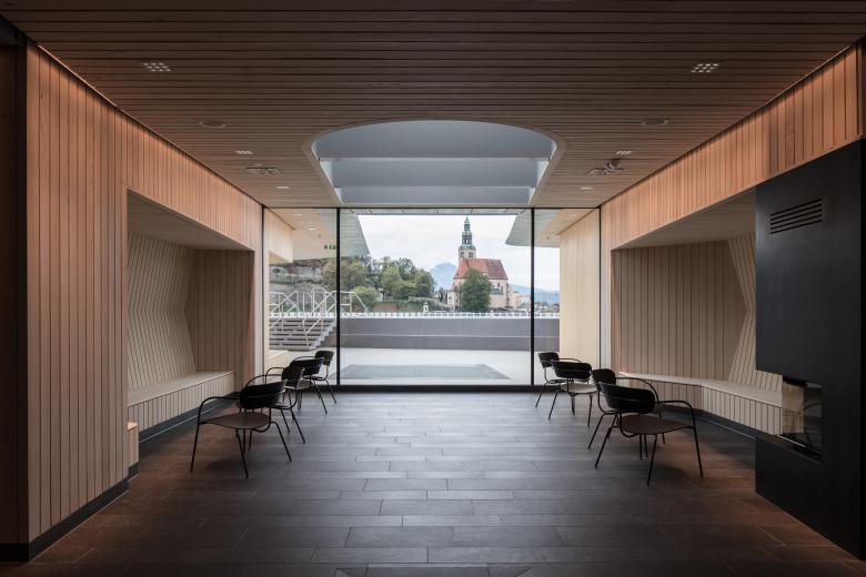 The gastronomic and sauna facilities are located at the top of the building. Three saunas face the city with panoramic views, while the central and largest sauna is both, sauna and lounge, focusing on the Pfarrkirche Mülln (Mülln Parish Church). A relaxation zone provides an unobstructed view of the hilly landscape to the North and Maria Plain. In the outdoor pool, guests have the sense of bathing above the city’s rooftops, its highest point.