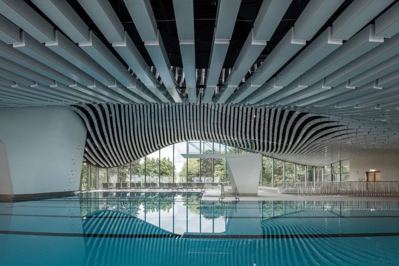 Wide central stairs lead in a continuous movement from the main entrance in the west through the three plinths floors to the swimming level’s. The daylight shining through guarantees consistent natural lighting. The swimming level features four different pools, from a sports pool to a diving pool, a kiddie pool and the relaxation pool. A continuous band of large, storey-height glass elements forms the boundary to the outside bringing the urban surroundings’ beauty deep into the space. The materialization of the waterscape is provided by ceramic surfaces, water and light, bordered from above by the gentle shapes of the wavy ceramic ceiling. The animated ceiling with its different heights underscores the variety to be found in the spatial and atmospheric context.
