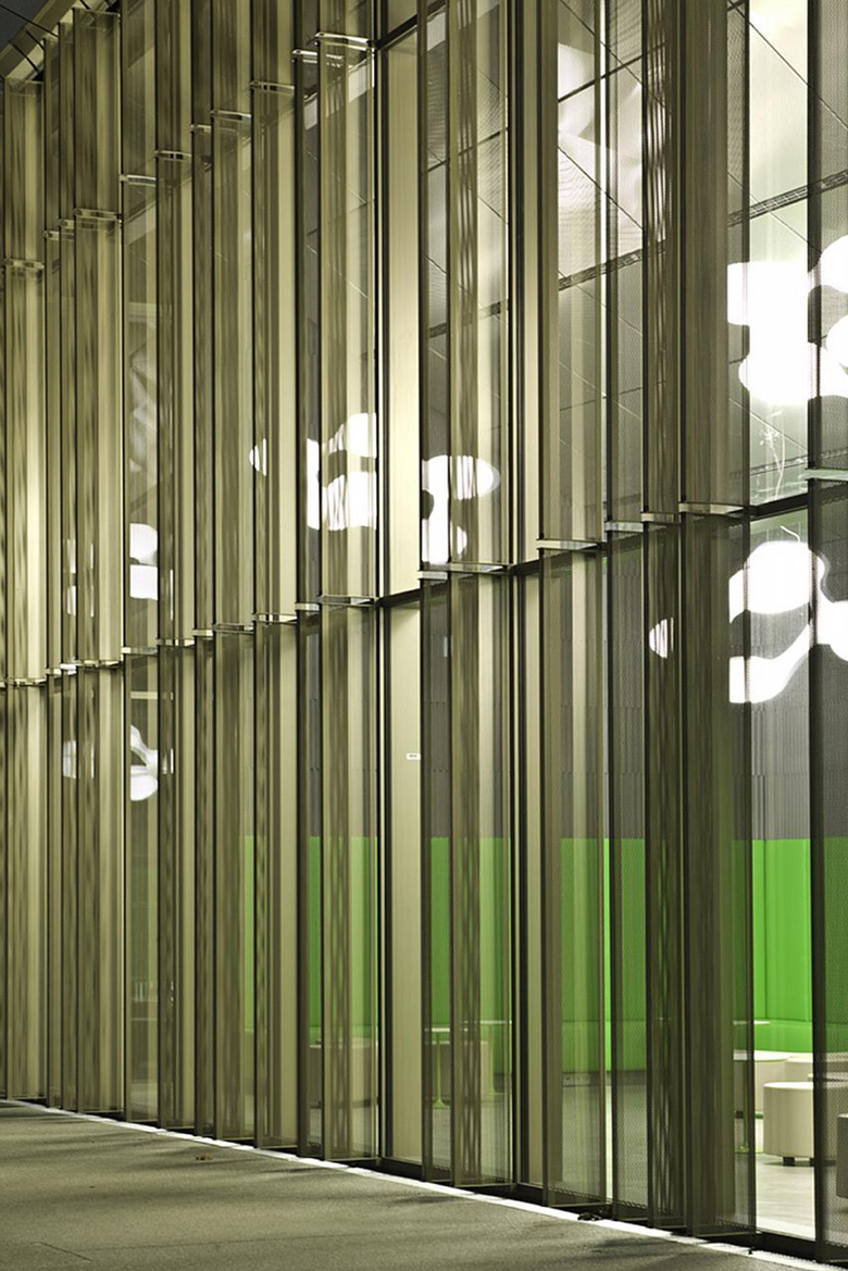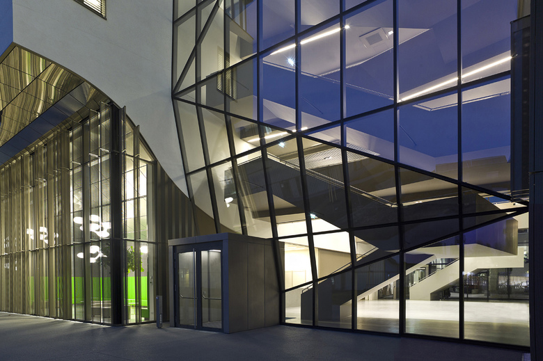 Sculpted staircases follow along the bended glazed façades. Lecture halls and the different departments with their laboratories and offices are located in the upper floors.