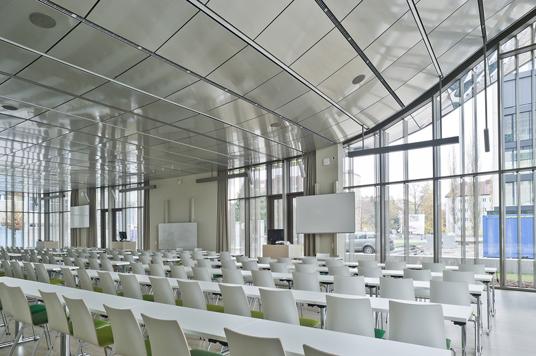 The building consists of two volumes, linked together by a glazed atrium. The ground floor is designed as transparent zone that opens up to the campus. It contains a multipurpose lecture hall on the west side which can be divided into three auditoriums or functions as one audimax. On the eastside there is a lounge for studying and communication that creates a view towards the campus, as well as a meeting room and secondary functions. The foyer situated in between the two volumes extends to the first floor.