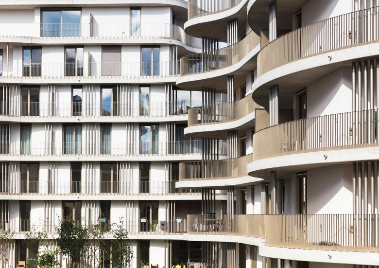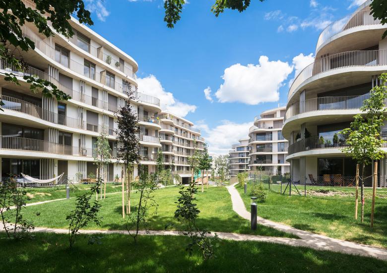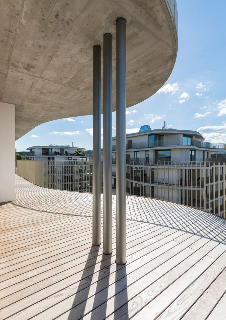 Aufgrund der freien Form der Häuser, sowie der Variation in Geschoßzahl und der Höhenniveaus bieten die Wohnbauten eine enorme Vielfalt bei gleicher Grundstruktur und ökonomischer Bauweise. Hervorzuheben ist das breite Angebot differenzierter Grundrisstypen. Die umlaufenden Balkone verleihen den Baukörpern Leichtigkeit, und lassen die Grenzen des Gebäudes verschwimmen. Gleichzeitig erzeugen sie Außenräume in West-Süd-Ost-Ausrichtung und schaffen Privatheit gegenüber Nachbarn.