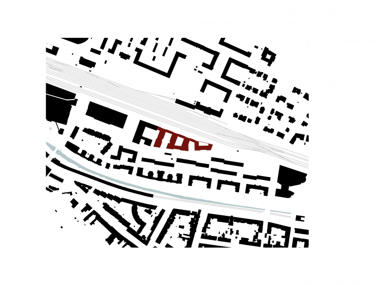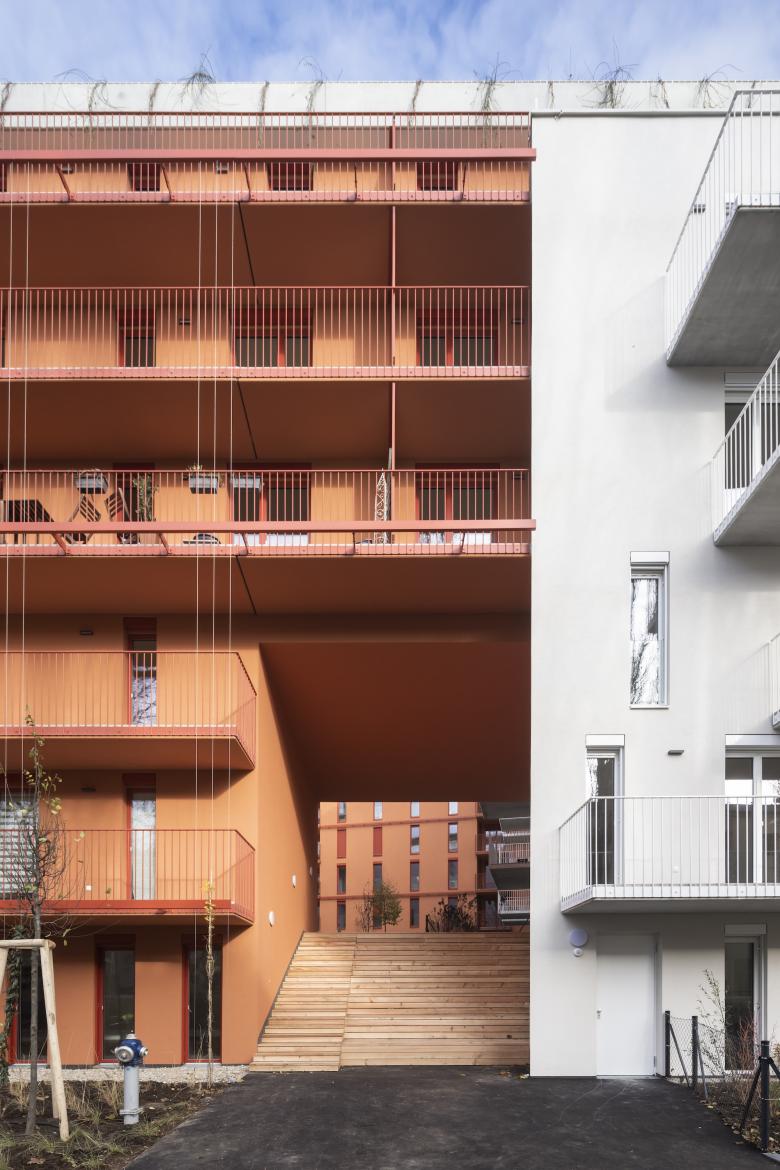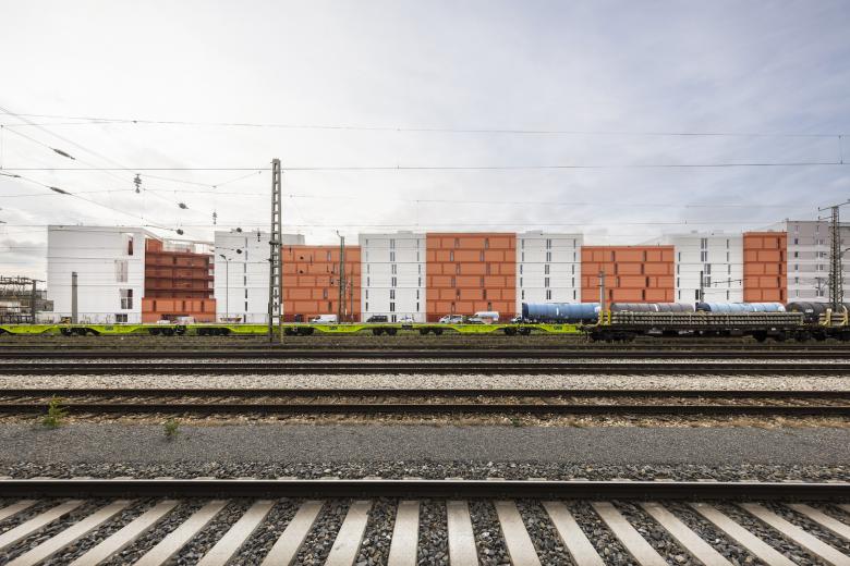 Der Höhenunterschied zum Bahngelände im Norden ist prägend für das Projekt. Der Widmung entsprechend stufen sich die Baukörper vom höheren Bahnniveau ausgehend, absteigend nach Süden und zur bestehenden Wohnbebauung ab. Als Folge sind alle Wohnungen ausschließlich nach Süden, Westen und Osten ausgerichtet.