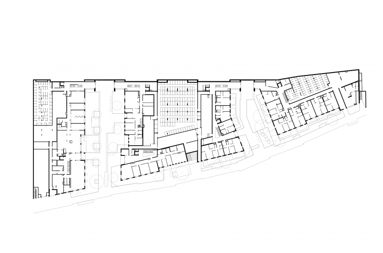 Das Ensemble besteht aus einer Abfolge von fünf Häusern quer zum Wienfluss, sowie verbindenden Bauteilen längs des Tals. Die Nordseite zur Bahn zeigt sich als langer, rhythmisierter „Rücken“, mit einzelnen verglasten Öffnungen in die Innenhöfe. Die teilweise offenen und teilweise geschlossenen Höfe sind das Herzstück der Anlage und eignen sich bestens für Kommunikation und Interaktion im Freien.