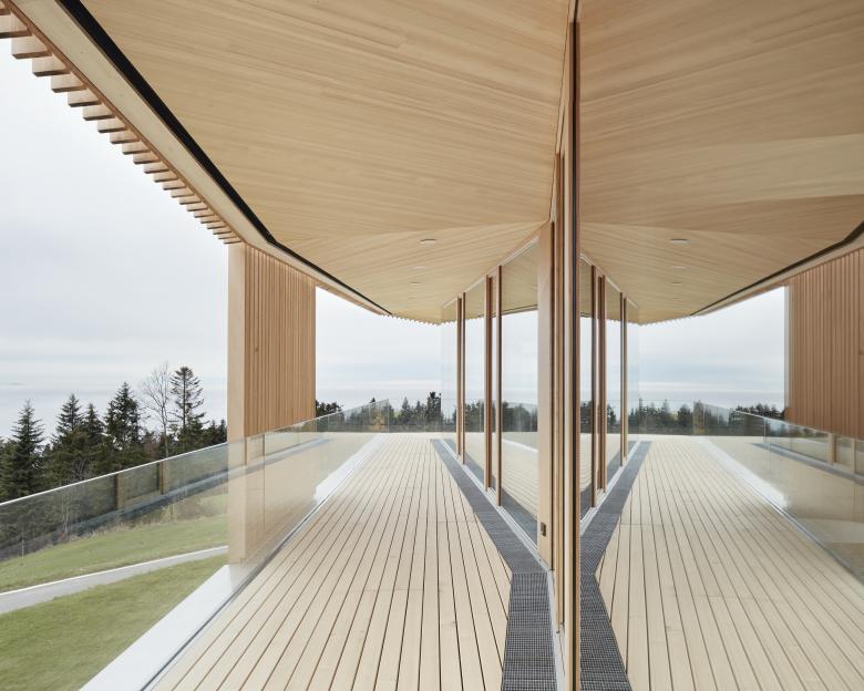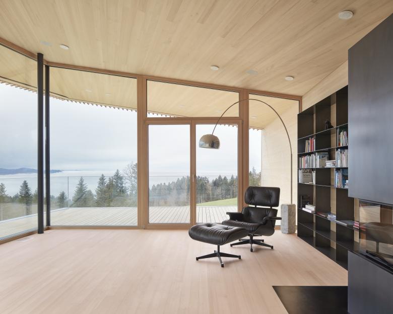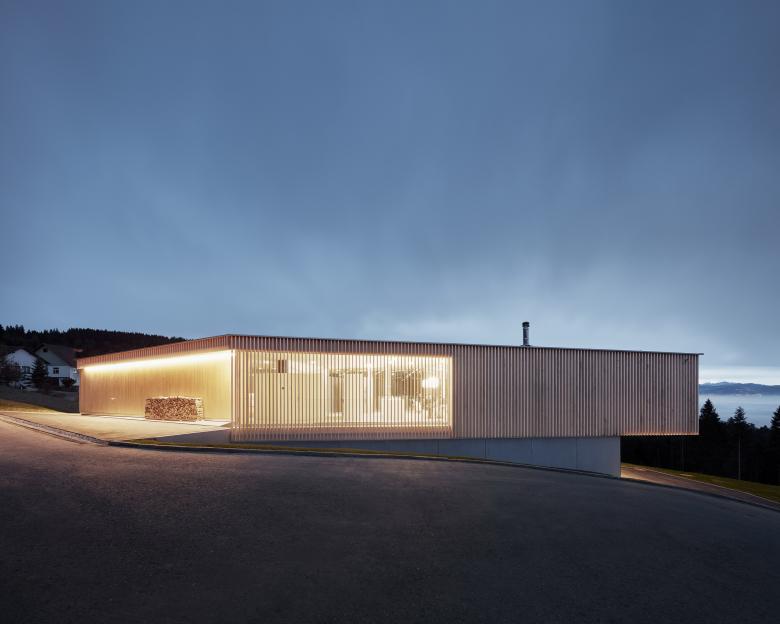 Die vertikale Fassadenstruktur generiert feine Abstufungen der Transparenz. Geseifte Weißtanne, fließende Räume und ein Kamin aus Schwarzstahl schaffen im Inneren eine ruhige Atmosphäre.